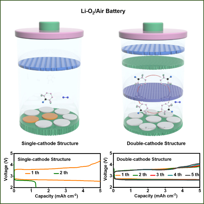 图1 单正极和新型双正极结构Li-O2电池的结构示意图及其对应的循环性能。