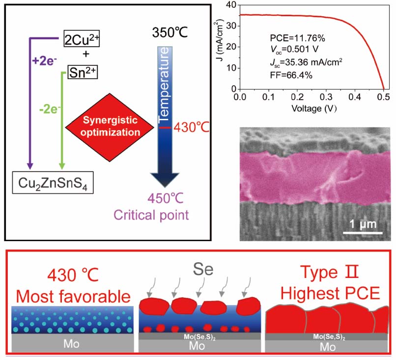 对于DMF溶剂体系的Cu2ZnSn(Sx,Se1-x)4 (CZTSSe)太阳能电池,不理想的结晶质量,是限制其开路电压和光电转换效率提高的关键因素。在本工作中,采用Cu2+、Sn2+氧化还原体系与预退火温度的协同优化,提出了一种实现CZTSSe单层贯穿吸收层的新策略。利用结构、形貌、电学和光电表征方法研究预退火温度对吸收层质量的影响,确定最佳预退火温度为430℃。通过探究单层贯穿吸收层的生长机理和氧化还原反应速率对吸收层晶粒生长的影响,提出了三种吸收层生长机制和临界温度的概念。这种单层贯穿吸收层的器件,有效抑制了晶界和界面载流子的复合。获得了高开路电压0.501 V和11.76%的器件效率,均为目前DMF基太阳能电池的最高值。
