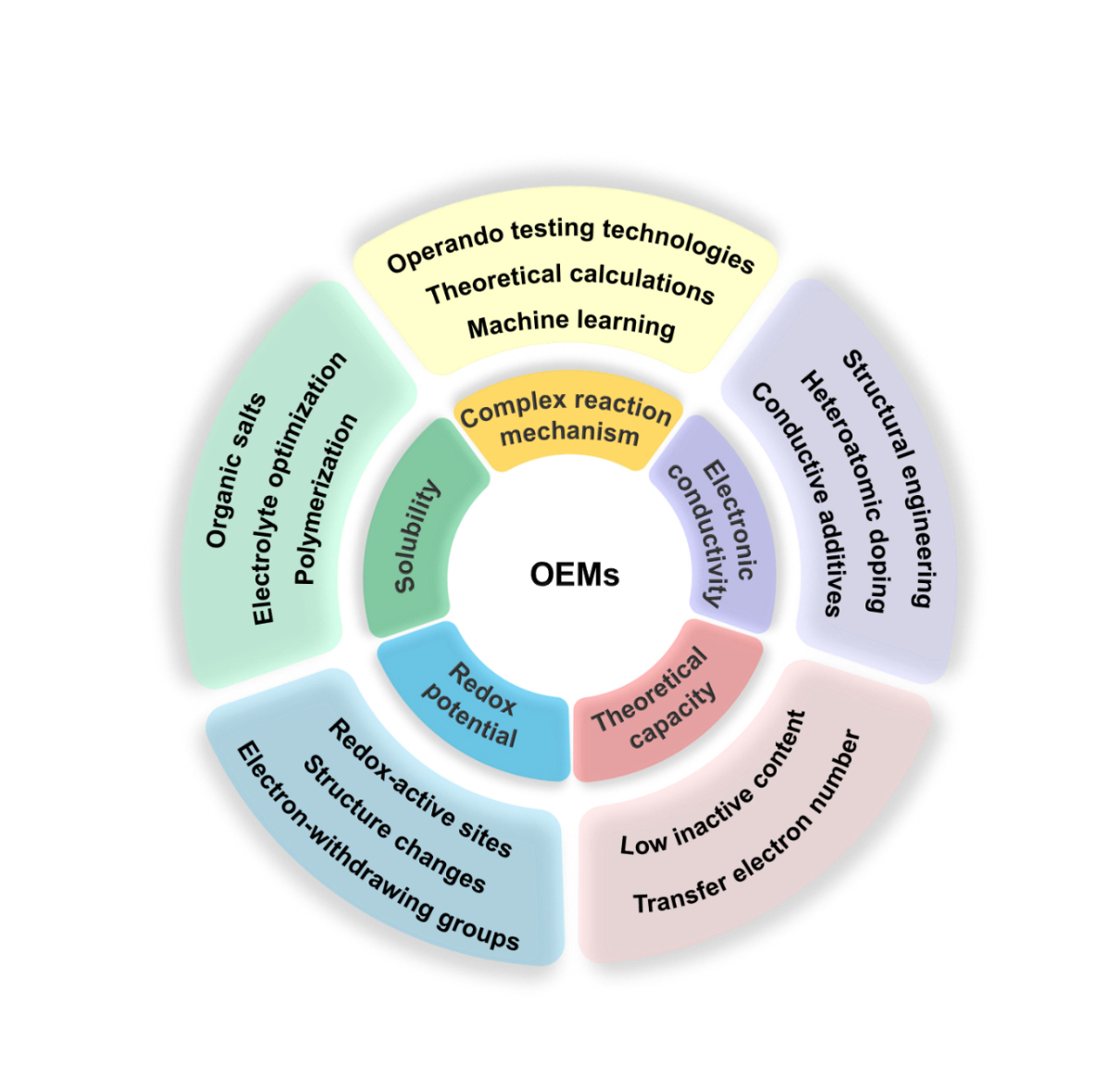 “碳达峰和碳中和”战略需要高能量密度和环保可持续的可充电电池体系,其中,有机电极材料具有比容量高、资源丰富、结构可设计、绿色环保等优点,为开发可降解环保的可充电电池提供了极具吸引力的解决方案。然而,大多数有机电极材料具有较差的电子导电性,且在常见有机电解液中的稳定性不佳,最终导致有机二次电池的容量不断衰减,并表现出较差的循环及倍率性能。从微观到宏观层面阐明产生上述问题的原因并系统总结对应的解决策略,对于新型有机电极材料的探索和开发具有重要意义。
