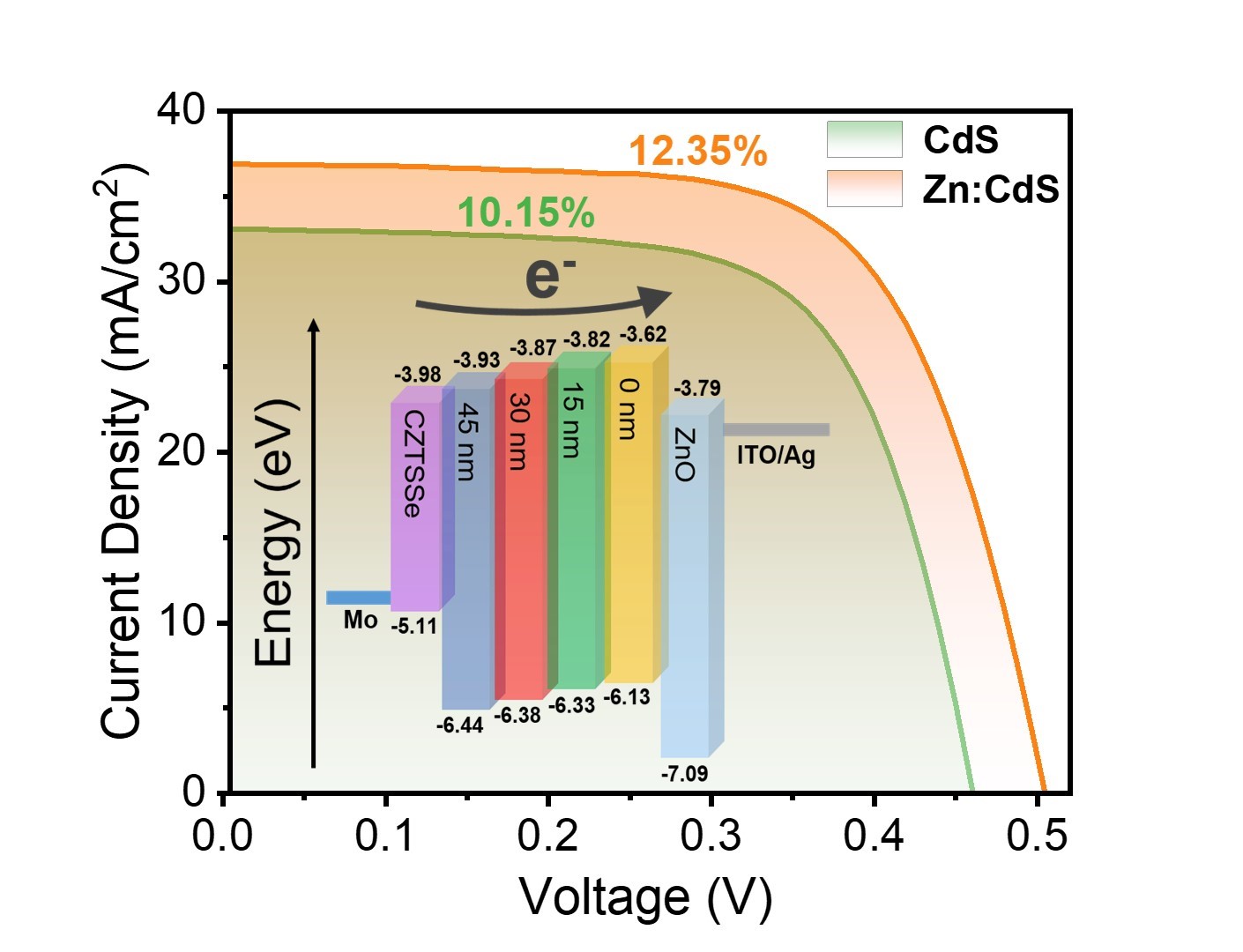 图1. 梯度带隙ZnCdS缓冲层器件能带结构和性能。