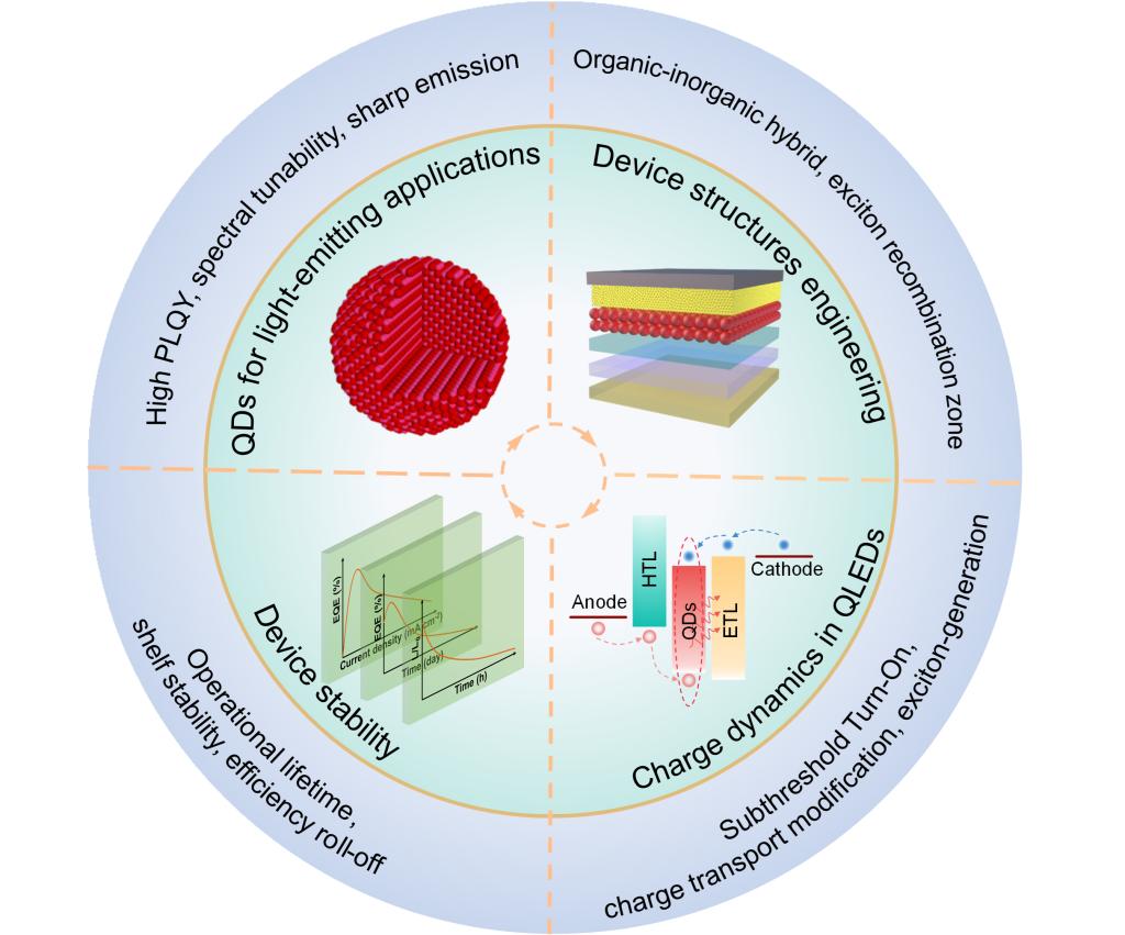 该篇综述着重于QLED的材料和器件物理学的研究进展,目的是加快其商业化进程。首先,回顾了QD的独特光学特性和器件结构的演变历程,然后详细讨论了对器件性能有决定性影响的载流子动力学。此外,强调了器件稳定性是商业化的主要障碍,包括运行稳定性和储存稳定性。最后,讨论了QLED器件中尚未解决的物理问题,并对未来的研究方向提出了一些思考。这篇评论有望促进对QLED器件物理的进一步研究,并促进QLED在显示和固态照明领域的发展。
