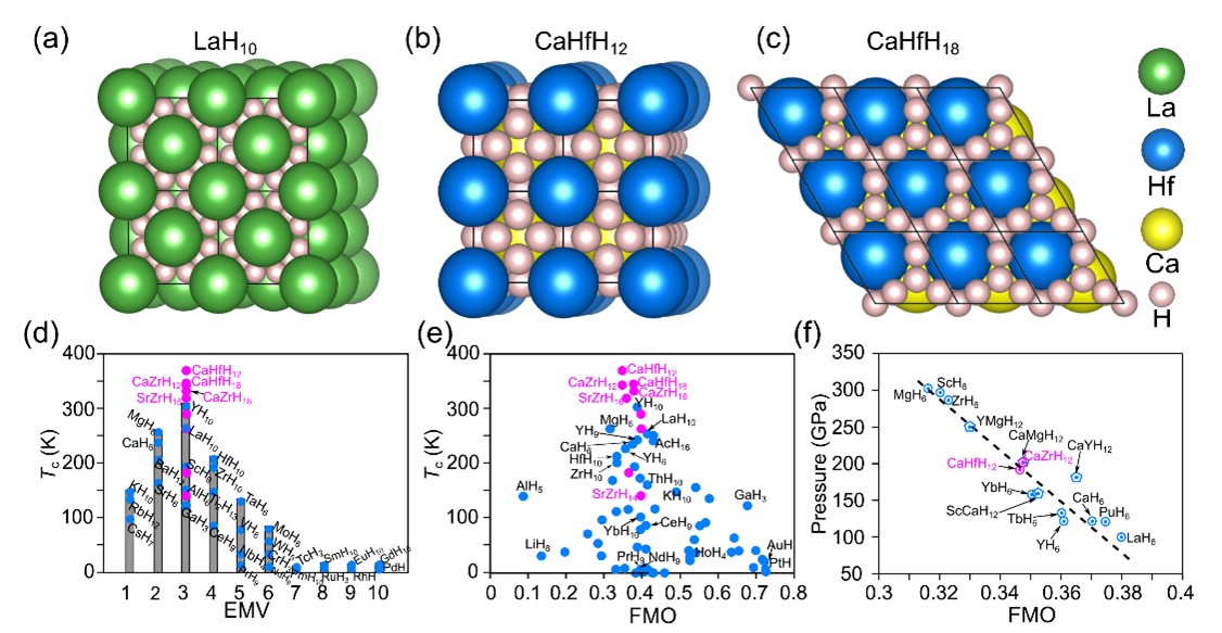 图1:(a) - (c)分别为氢化物LaH10,CaHfH12和CaHfH18的结构图。(d)和(e)分别表示超导转换温度Tc与金属有效价电子数(EMV),金属体积占位比(FMO)之间的依赖关系。(f)在给定氢与金属的比例下,金属的体积占位比与其提供的化学压成线性关系。粉红颜色的体系为该文新预言的三元氢化物超导体,蓝色为已知的氢化物超导体。