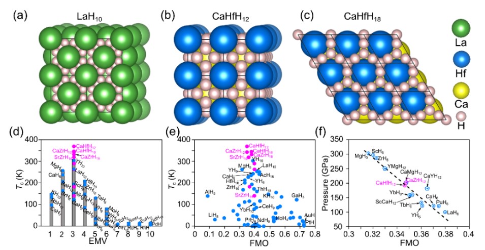 图1:(a) - (c)分别为氢化物LaH10,CaHfH12和CaHfH18的结构图。(d)和(e)分别表示超导转换温度Tc与金属有效价电子数(EMV),金属体积占位比(FMO)之间的依赖关系。(f)在给定氢与金属的比例下,金属的体积占位比与其提供的化学压成线性关系。粉红颜色的体系为该文新预言的三元氢化物超导体,蓝色为已知的氢化物超导体。