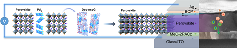 图1. 定制功能化氧化石墨烯纳米片,稳定钙钛矿结构示意图;器件结构示意图。