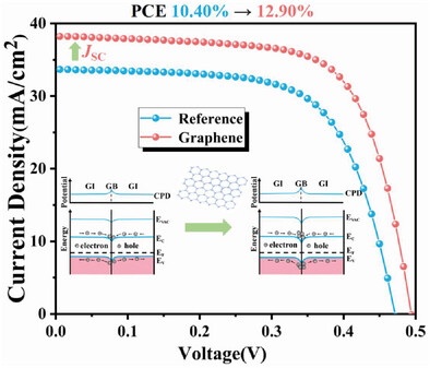 铜锌锡硫硒(CZTSSe)被认为是最具有发展潜力的绿色薄膜光伏材料之一。目前CZTSSe薄膜太阳电池基本都采用多晶薄膜材料作为光吸收体,在吸收层存在着大量晶界 (GBs),这些区域可能存在大量由于周期性破坏导致的禁带内电子态,成为载流子陷阱、散射和复合中心,从而严重地制约光伏器件的性能。前期文献报道,二维材料石墨烯可以分布在多晶薄膜材料的晶界,消除不良的晶界效应,从而实现与单晶相同的电荷输运特性。基于此,本研究提出利用石墨烯的高导电性和高迁移率特性将其引入到CZTSSe前驱体溶液中,高温硒化后石墨烯可分布在CZTSSe多晶薄膜的晶界,从而改善晶界之间的载流子传输,提升光伏器件的性能。本研究工作提出了一种有效钝化CZTSSe吸收层多晶晶界的方法,为提高CZTSSe吸收层的光生载流子收集效率提供了一种有针对性的策略。