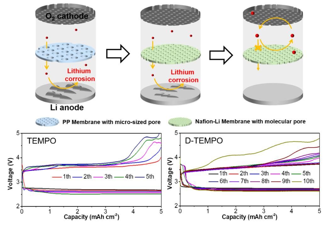 图1 液相催化剂和离子传输膜双重调控策略提升锂氧气电池循环稳定性。