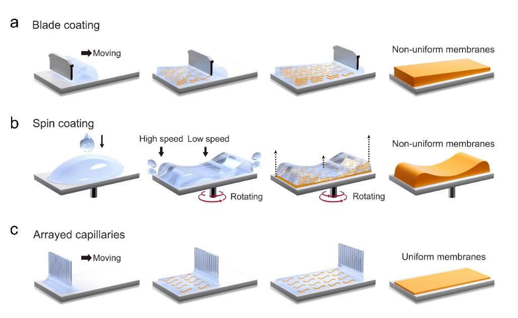 图1. 传统a)手术刀法和b)旋涂法制备聚合物膜的过程;c)新型毛细管阵列技术制备薄且均匀聚合物膜的过程。