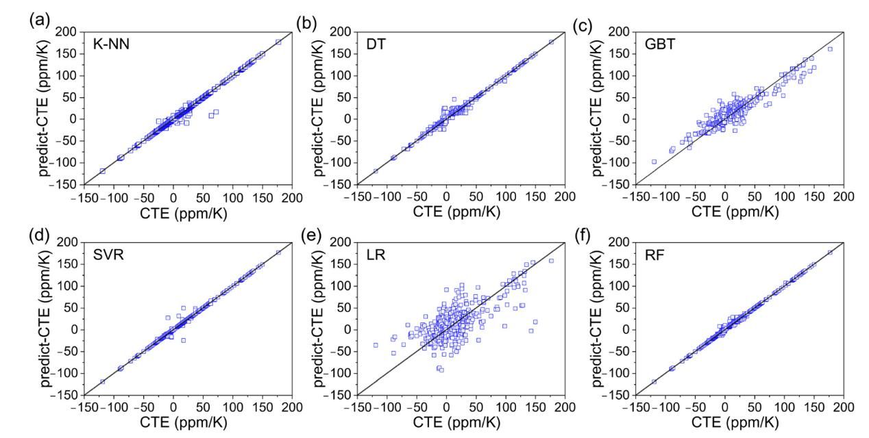 图1 (a)-(f)不同机器学习回归方法对材料的负热膨胀系数预测拟合图,图中表明随机森林方法对负膨胀材料的预言结果最好。
