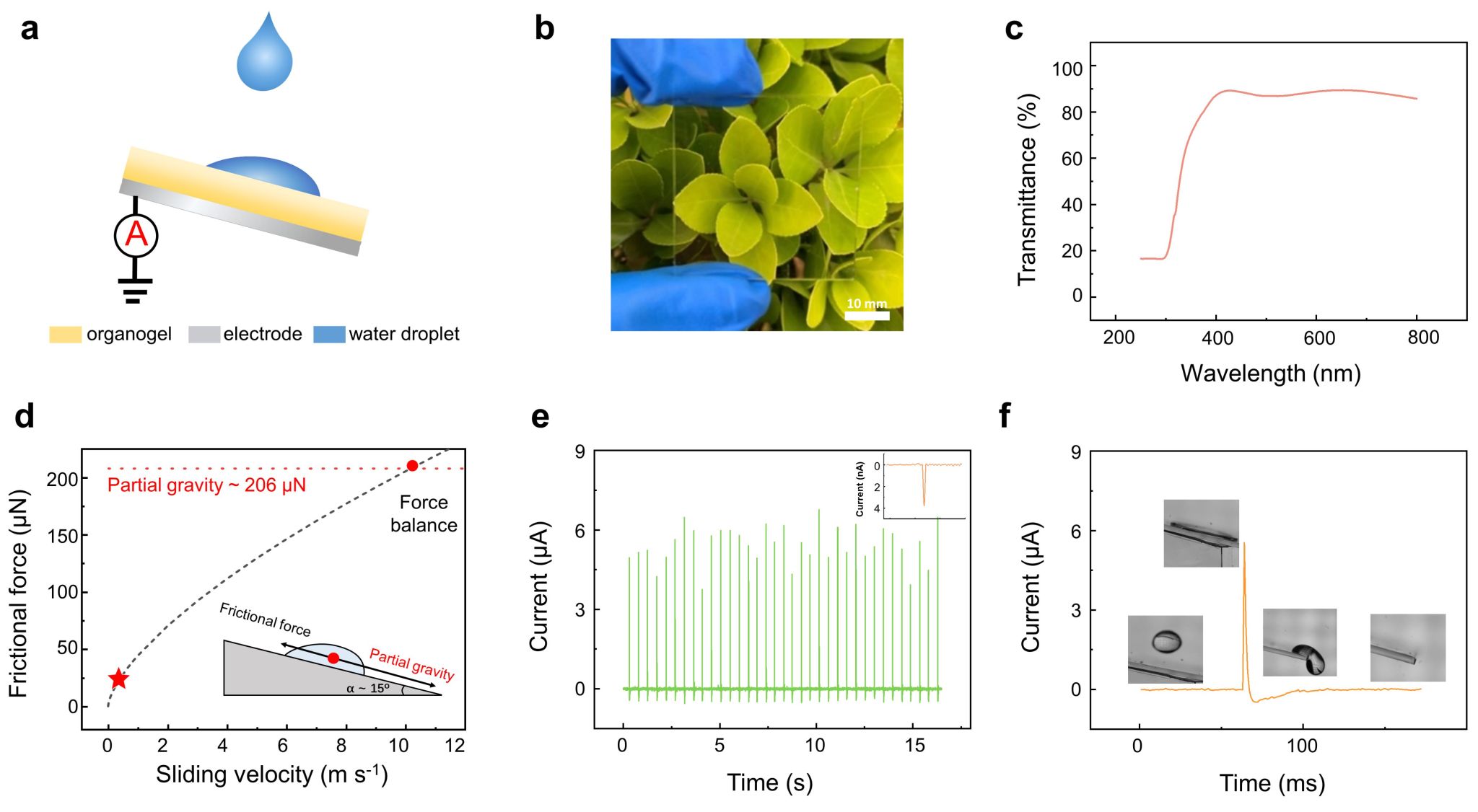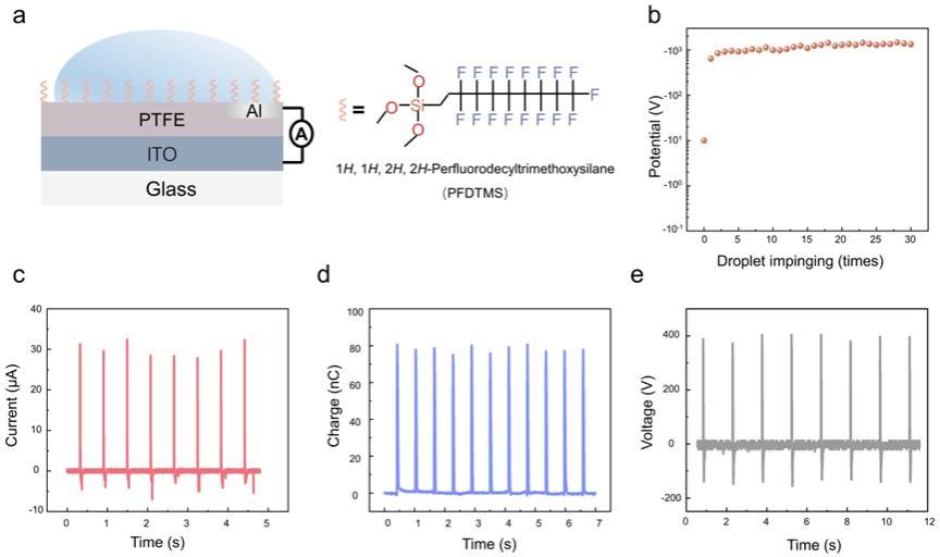 图3. 器件的结构、输出性能以及水滴在凝胶表面的运动状态分析。