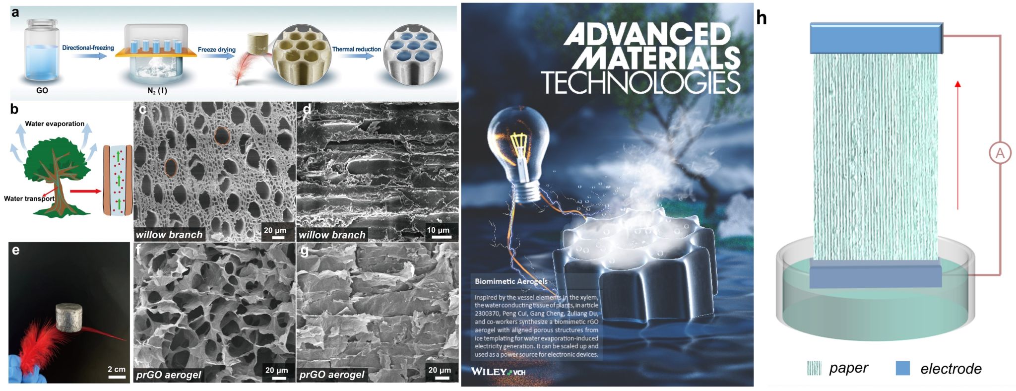 另一方面,受木本植物木质部中导管结构的启发,在定向冰模板的辅助下,我们制备了具有对齐多孔结构的仿生石墨烯气凝胶。由于具有优异的蒸发输水率,有效地提高了水伏发电的性能。该研究成果以Biomimetic Aerogel with Aligned Porous Structures from Ice Templating for Water Evaporation-Induced Electricity Generation为题在国际学术期刊Advanced Materials Technologies上发表。该研究成果被国际仿生工程学会推荐报道。iQQTV