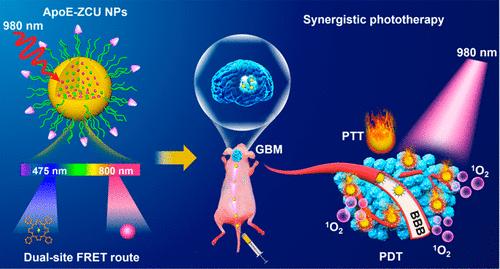 多形性胶质母细胞瘤(GBM)是一种最常见的恶性脑肿瘤,其较低的患者生存率主要是由血脑屏障(BBB)和高浸润性等问题所导致的。基于上转换纳米粒子(UCNPs)的深穿透近红外(NIR)光学治疗是一种很有前景的胶质瘤治疗方法,但其也存在光谱不匹配和单位点Förster共振能量转移(FRET)导致的光能利用率低等问题。我们设计了一个脑靶向的近红外诊疗系统,该系统具有双位点FRET通路和优越的光谱匹配性,可以最大限度地利用能量来实现对胶质瘤的光动力-光热协同治疗。实验对Tm掺杂的UCNPs,四苯基卟啉锌(ZnTPP)和硫化铜(CuS)纳米粒子进行多重优化调制,制备了该纳米体系。首先,研究者精确调整了Tm的掺杂比,使得UCNPs在475 nm处的相对发射强度提高了11.5倍。此外,ZnTPP的J聚集体也能够增加单体在475 nm处的吸收(163.5倍)。研究发现,两者都能够优化UCNPs和卟啉之间的FRET匹配性,以实现有效的近红外光动力治疗。同时利用800 nm处的发射来放大CuS纳米粒子的光热效应,从而通过第二种FRET途径进行光热治疗。经脑靶向肽修饰后,该系统可有效触发协同性光学治疗,消融胶质瘤细胞,并且其能够穿越血脑屏障和靶向胶质瘤,从而显著延长原位荷瘤小鼠的生存期。综上所述,该研究开发的光谱调制和双位点FRET策略有望为最大限度地利用UCNPs的光能以治疗脑部疾病提供新的借鉴和参考。