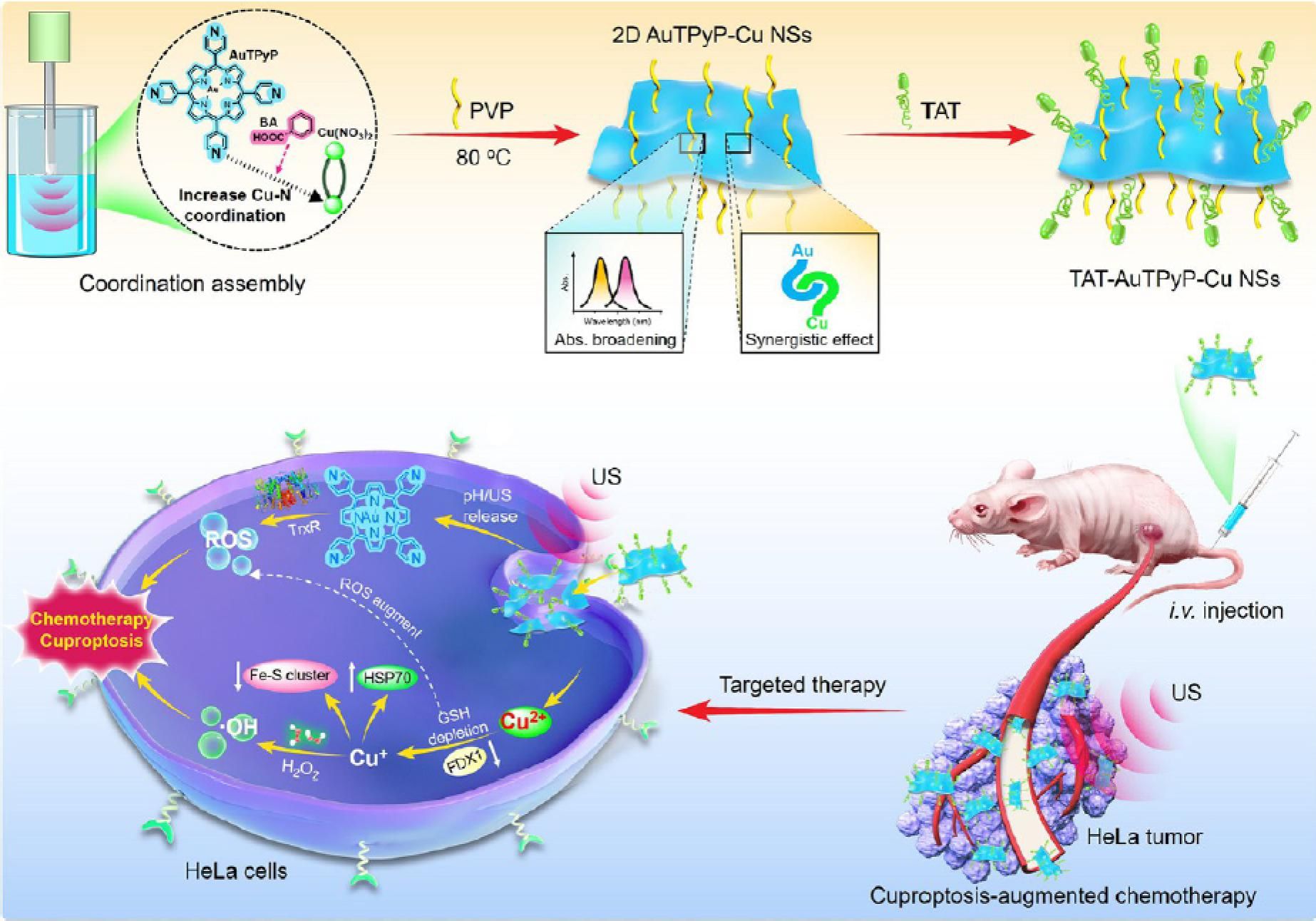 图1. 配位组装AuTPyP-Cu MOF纳米超薄片pH/超声双响应用于协同触发铜死亡增强化疗