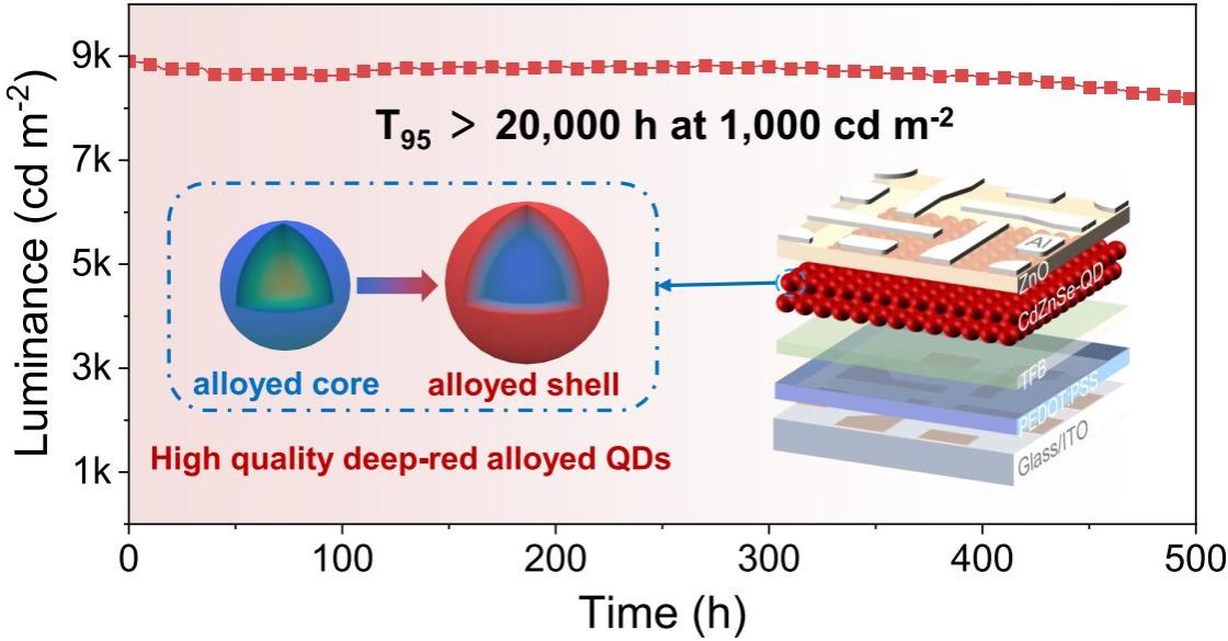载流子注入的不平衡性仍制约着器件稳定性的提升,难以满足当前显示应用的要求。另一方面,合成发射波长超过630 nm(广色域的理想只选)的高质量CdSe QDs仍面临挑战。基于此,研究团队与北京理工大学合作合成了具有连续梯度、双合金核壳结构的深红色ZnCdSe/ZnSeS量子点实现了高性能深红色QLED的构筑。其中器件在200-90000 cd m-2亮度范围内其EQE超过20%,并且1000 cd m-2亮度下的T95寿命超过20000小时;此外,器件还具有出色的贮存稳定性(> 100 天)和循环稳定性(> 10个电压循环)。研究成果以“Ultrastable and High-Efficiency Deep Red QLEDs through Giant Continuously Graded Colloidal Quantum Dots with Shell Engineering”为题,发表在国际主流期刊Nano Letters上。实验室2019级硕士研究生刘校楠为第一作者,iQQTV