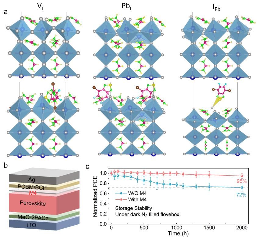 针对上述问题,课题组选择了一种具有多个活性位点的有机小分子(4,7-溴-5,6-氟-2,1,3-苯丙噻二唑)M4来钝化铅碘反位缺陷和碘空位缺陷。我们发现,M4中的溴(Br)和氟(F)基团可以与铅(Pb)相互作用,纠正晶格畸变并钝化碘空位(VI)缺陷和PbI缺陷。硫(S)基团与碘协调,减少I-I二聚体并钝化IPb缺陷。经过M4优化后的器件效率达到了25.1%。在氮气环境中储存2000小时后,该器件保持了其初始效率的95%。总体而言,这项工作突出了钙钛矿中多位点协同钝化的优势,并为钙钛矿钝化策略提供了一种新方法。(DOI: 10.1002/adfm.202409852)