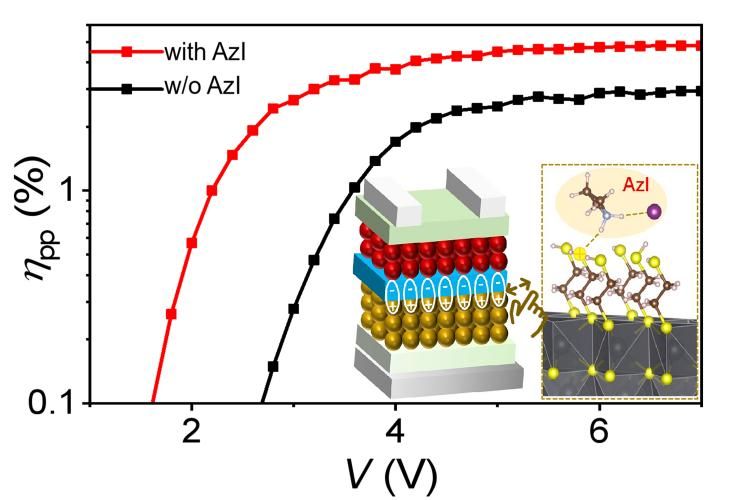 PbS量子点红外上转换器件在AzI处理连接层界面前后的光子-光子转换效率随电压的变化。(内图:AzI与PbS表面配体相互作用示意图)