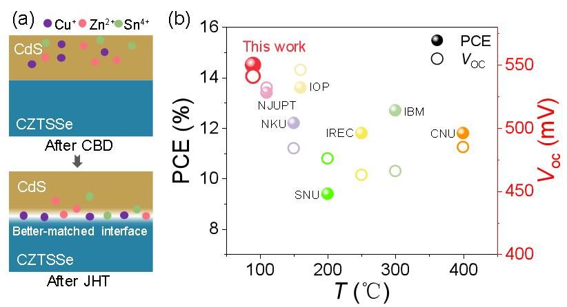在锌黄锡矿太阳能电池领域,CdS/Cu2ZnSn(S,Se)4(CZTSSe)界面的非辐射复合导致开路电压(Voc)和填充因子(FF)较低,解决缓冲层中的杂质和结构缺陷对于提高性能至关重要。武四新课题组提出了一种方便的低温退火和In掺杂缓冲层组合策略,以建立一个电性良性的高质量CdS:In/CZTSSe异质结。结果表明,低温退火有助于从缓冲层向吸收层侧迁移Cu、Zn和Sn杂质元素,并改善了CdS和CZTSSe之间的晶格匹配。观察到的Cu耗尽和Zn和Sn杂质含量的减少可以在缓冲层中消除有害的CuCd受主缺陷,并减少导带(CBO)势垒。In掺杂增加了InCd施主浓度和缓冲层的结晶度,从而改善了电子传输和提取过程。因此,CdS:In器件的较少缺陷界面实现了最高效率14.5%,Voc不足从348 mV降低到287 mV,FF从66.6%增加到70.3%。该研究为界面缺陷钝化和能带工程提供了新的解决途径,对锌黄锡矿太阳能电池界面改善具有重要意义。