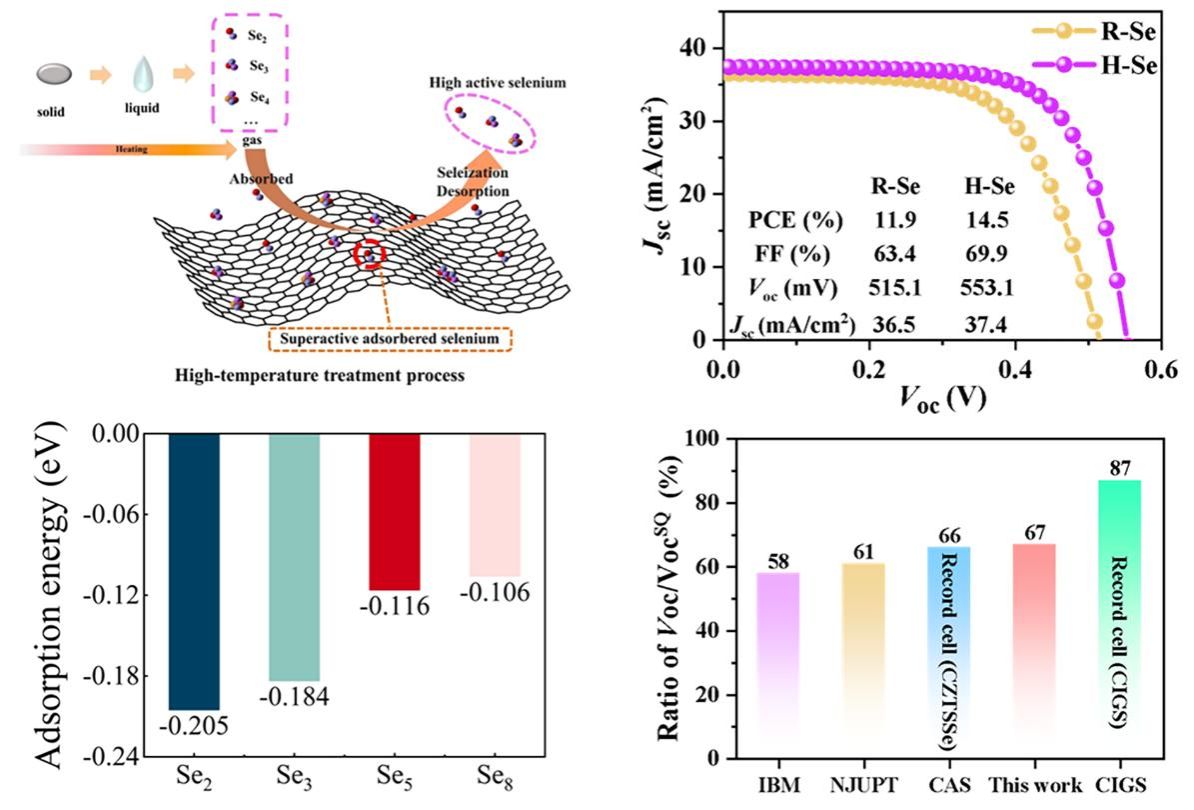 硒扩散和反应活性差导致的吸收层硒化不充分和元素分布不均匀是限制Cu2ZnSn(S,Se)4 (CZTSSe)太阳能电池效率的主要问题之一。提高硒的活性对于制备高质量吸收层和提升CZTSSe电池效率至关重要。本工作通过对装有硒颗粒的石墨盒进行高温热处理有效提高了硒的活性。结果表明,具有松散多孔结构的石墨在高温处理过程中对高活性小分子Se3和Se4表现出更强的吸附能力,使小分子硒有效储存在石墨中。再以该石墨盒进行硒化时,吸附的活性硒可以在低温下以气态形式快速解吸附,迅速提高硒化早期的硒分压,促使硒在低温下快速均匀地扩散到CZTS前体膜中。这不仅有助于在表面和底部同时成核和结晶,形成薄膜的双向晶粒生长模式,还可以抑制阳离子的向上迁移和聚集,促进元素均匀化,钝化化学环境不平衡造成的[2CuZn+SnZn]等深能级点缺陷和缺陷簇。该策略不仅简单安全、无毒环保,且制备的小分子硒具有较高的扩散活性和化学活性,将CZTSSe电池效率优化至14.5%,其中67%的VOC/VOCSQ是目前报道的最高值之一。