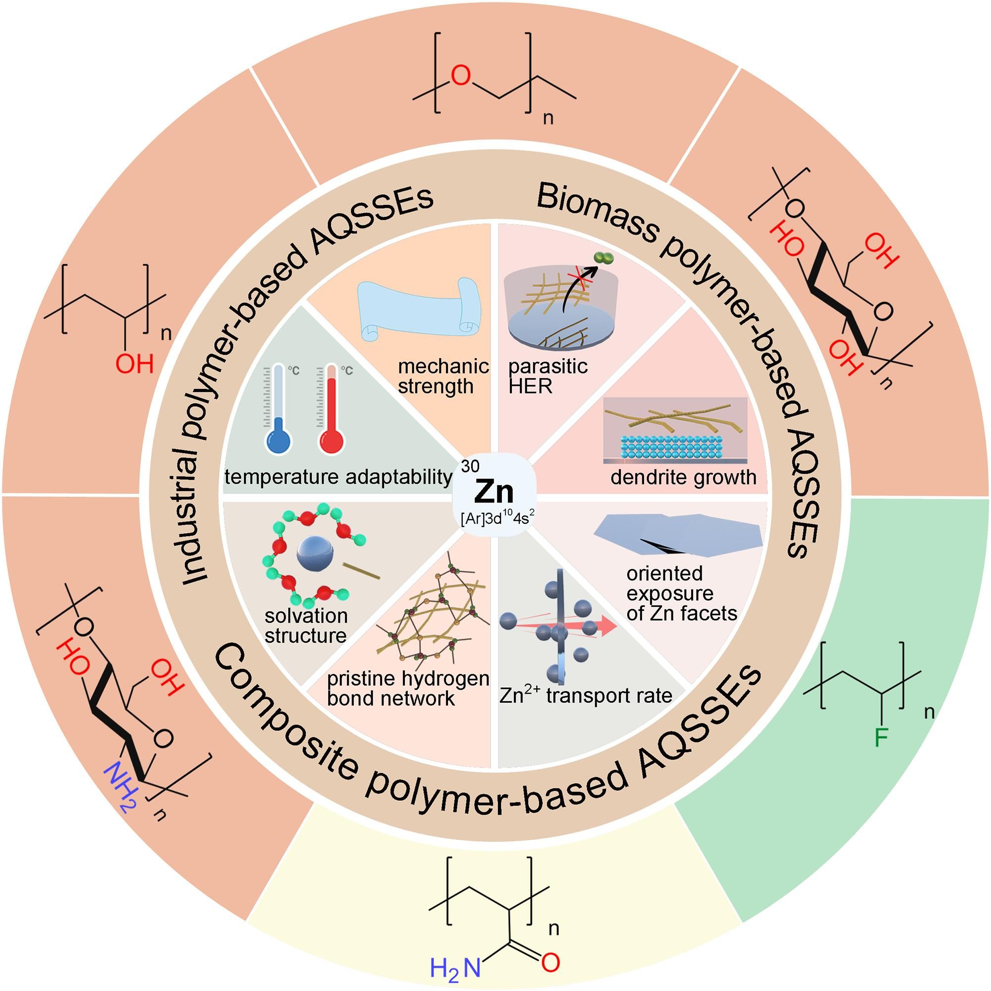 可穿戴和智能柔性设备的快速发展对储能设备提出了严格的要求,包括优异的机械强度、本征安全性、高能量密度和生态友好性。基于包含电负性原子(O/N/F)官能团的功能化水系准固态电解质(AQSSE)是为柔性器件供给能源的锌离子电池(Zn-ion batteries, ZIBs)的优异电解质。在这篇综述中,我们对近年来在柔性器件中使用AQSSE的研究成果进行了全面的总结,尤其关注不同官能团的对器件性能的影响。首先,我们介绍了ZIBs的基本原理,并从器件优点和缺点两方面讨论了器件存在的挑战。然后,对功能化AQSSE稳定柔性ZIBs的机理进行了总结和阐述。在此基础上,根据聚合物的官能团种类,总结了近年来使用AQSSE增强ZIBs电化学稳定性的研究进展和针对AQSSE的先进表征方法。最后,我们展望了该领域所面临的挑战和未来方向。