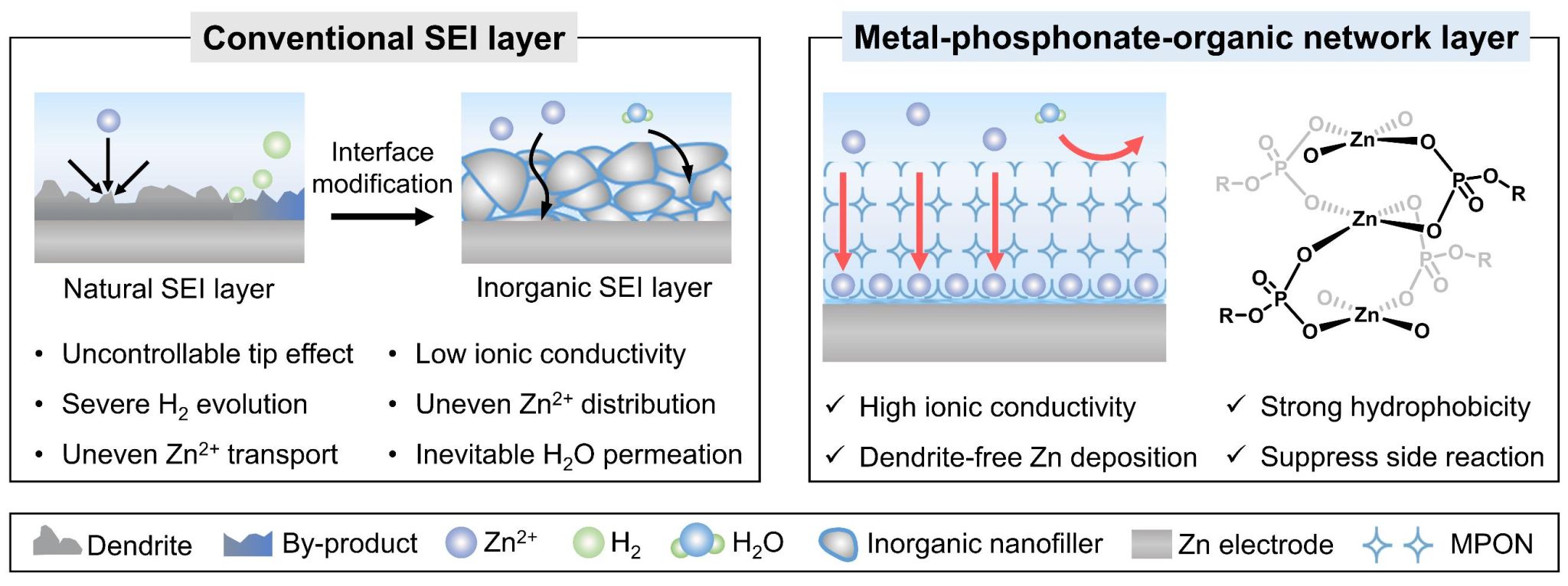 赵勇课题组与中国科学院理化技术研究所闻利平团队合作,在水系锌金属电池领域取得新进展,相关成果以“Metal-Phosphonate-Organic Network as Ion Enrichment Layer for Sustainable Zinc Metal Electrode with High Rate Capability”为题发表在国际化学期刊《德国应用化学》上(Angew. Chem. Int. Ed. DOI: 10.1002/anie.202411563)。