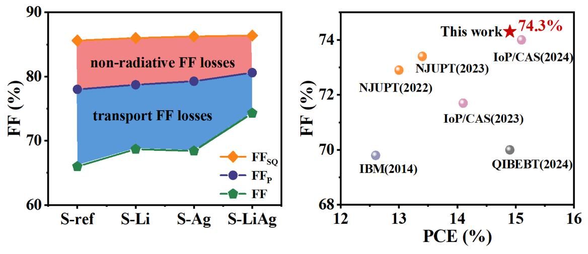 除了较大的开路电压损失外,填充因子(FF)的损失是限制CZTSSe太阳能电池效率进一步提升的关键。基于此,该工作对FF的损失机制进行了系统研究并通过Li&Ag共掺杂的策略有效提升了FF。结果表明,CZTSSe太阳能电池内FF的损失主要由载流子提取不足和严重的非辐射复合两个因素造成,且非辐射复合造成的FF损失约为7%,载流子提取不足造成的FF损失超过10%。其中,载流子的提取能力与CdS/CZTSSe异质结界面的能带排列息息相关,与吸收层载流子浓度关系不大,因此,尽管Ag掺杂降低了吸收层的空穴浓度和电导率,但由于其改进了异质结处的能带排列,仍然降低了载流子提取不足造成的FF损失。且Ag掺杂在钝化吸收层体相方面明显优于Li掺杂,这大幅度减少了非辐射复合造成的FF损失。相应地,Li掺杂在提高载流子浓度和调节CdS/CZTSSe能带排列方面则优于Ag,这大大减少了载流子提取不足造成的FF损失。总之,Li&Ag共掺杂策略不仅优化了载流子提取还抑制了严重的非辐射复合,使器件效率达到了14.91%,其中FF提升至了74.3%,是目前被报道的最高值。