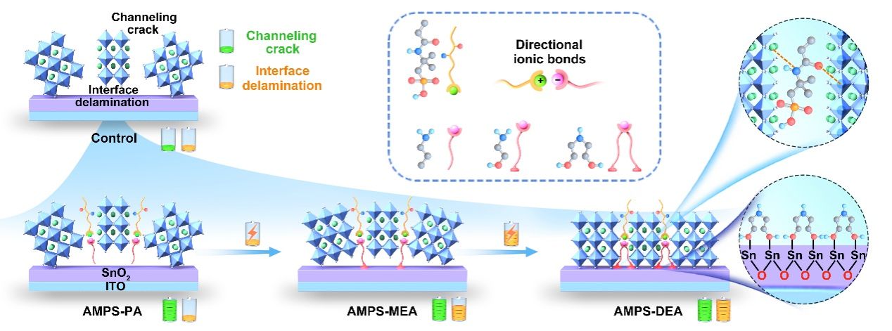 李萌教授团队开发了一种具有扩展官能团端基的原位聚合分子,以在热循环过程中保持机械稳定性。这些分子可以化学锚定在晶界上并交联相邻晶粒,增强晶体韧性并抑制断裂。同时,分子中的羟基结构与SnO2电子传输层形成双齿螯合,增强界面黏附并抑制分层。更重要的是,这些分子提供的松弛残余应力使钙钛矿能够适应温度变化,有效的匹配相邻层并防止机械故障。最终,经过改进后的设备实现了24.54%的光电转换效率,在10000次弯曲循环和200热循环后保持了95%以上的初始效率。该工作对提升FPSC的效率和热-机械稳定性具有重要意义。(DOI: 10.1002/anie.202421063)