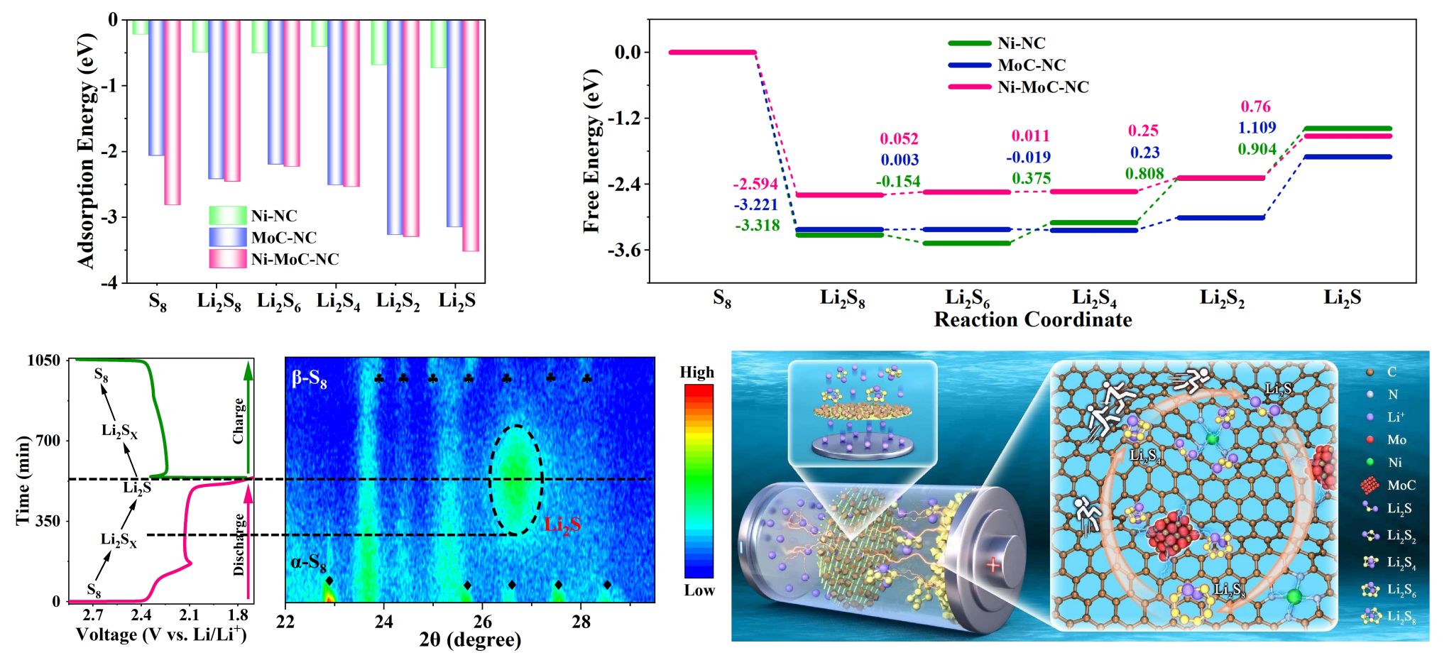 孙自许教授团队引入了一种新的双位点催化剂Ni-MoC-NC,它由镍原子锚定在氮掺杂碳(NC)基体和碳化钼(MoC)纳米簇中的氮位点(Ni-N4)上组成。选择Ni-N4位点是因为它们催化短链LiPSs还原的能力,而选择MoC纳米簇是因为它们具有优异的导电性和对LiPSs的强化学吸附能力。结合先进的表征技术,包括原位分析和密度泛函理论DFT计算,证实了双催化活性位点的存在及其在加速双向硫氧化还原反应中的协同效应。Ni-MoC-NC催化剂既可以作为阴极内的硫主添加剂,也可以作为Li-S电池中聚丙烯(PP)隔膜阴极侧的涂层进行测试。配备S/Ni-MoC-NC阴极和Ni-MoC-NC@PP改性隔膜的电池即使在高硫负载条件下也可以表现出优异的电化学性能。该研究强调了双位点催化剂在解决硫氧化还原反应的动力学挑战和减轻Li-S电池中的穿梭效应方面的有效性。这些发现为设计具有多个高效吸附催化中心的催化材料提供了有价值的见解,为其在下一代储能系统中的实际应用铺平了道路。