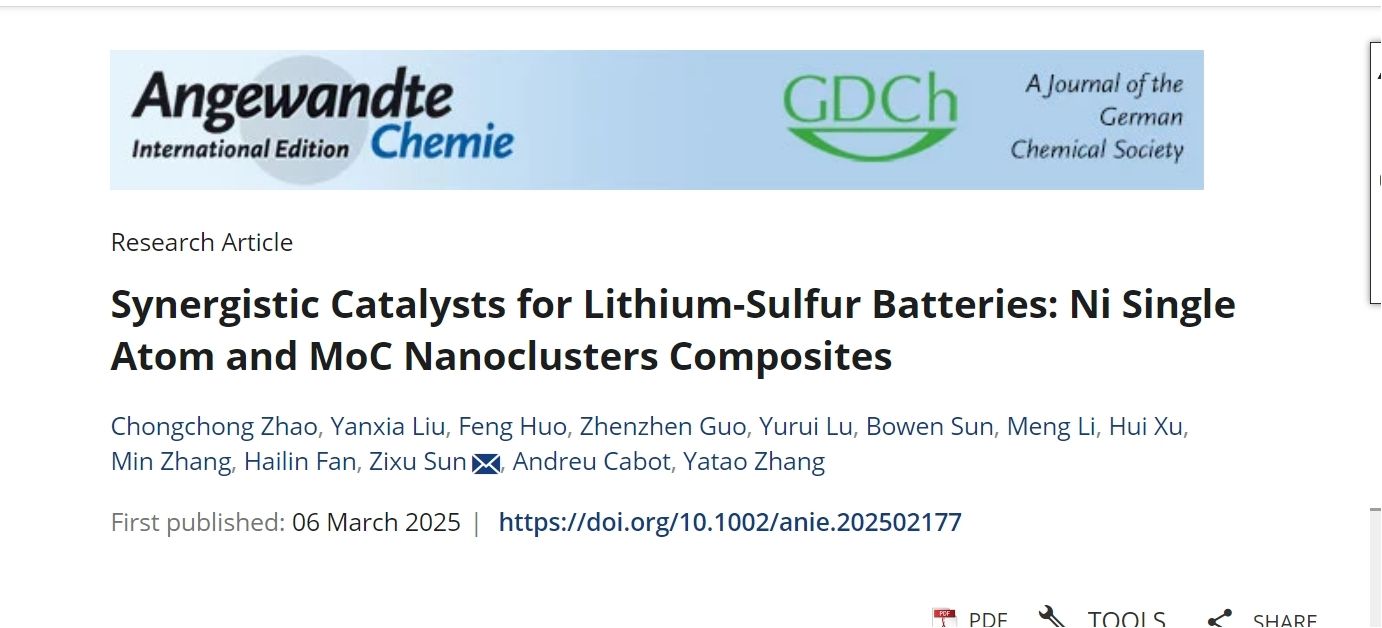 孙自许教授团队在储能电池领域取得新进展,该成果以“Synergistic Catalysts for Lithium-Sulfur Batteries: Ni Single Atom and MoC Nanoclusters Composites”为题,发表在顶级期刊国际顶级期刊《德国应用化学》(Angewandte Chemie International Edition)上。
