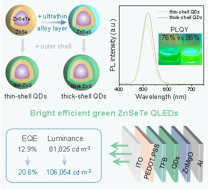 QD-LEDs以其高效、稳定及高色纯度的优异性能,已成为引领新一代显示技术发展的核心力量。然而,随着全球环保意识的日益增强,QD-LEDs技术的快速发展也面临新的挑战:如何在确保高性能的同时兼顾低毒环保性。这一需求推动了两大环保型量子点体系——InP和ZnSe量子点成为研究焦点。InP量子点虽能通过精细调控晶核尺寸来灵活调节发射光谱,但其制备过程依赖有毒且昂贵的磷前驱体,限制了其大规模应用前景。相比之下,ZnSe量子点通过与窄带隙ZnTe合金化形成三元ZnSeTe量子点来实现光谱调节,不仅展现出显著的光谱调控便捷性,还兼具可持续性和成本效益优势,为QD-LEDs技术的未来发展开辟了一条绿色且经济高效的路径。然而,ZnSeTe基量子点在绿光和红光QD-LEDs应用中,因缺乏有效的缺陷钝化策略而面临性能瓶颈。因此,如何通过量子点结构设计实现缺陷的高效钝化,是该研究的核心问题。