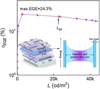 该工作采用种子诱导反向注入法,结合组分调控合成了新型蓝光核壳结构量子点,该量子点由大尺寸(≈10.5 nmCdSe@ZnSe梯度合金核和超薄ZnS外壳层组成。以该量子点为发光层,蓝光QD-LED的最大外量子效率(EQE)达24.3%,并且在2220~22910 cd/m2的亮度范围内,器件的EQE仍能保持在最大值的90%以上,显著抑制了效率滚降。器件性能提升的原因在于新型结构量子点抑制了缺陷态非辐射复合,减少了漏电流的产生,同时改善了器件中的电荷注入平衡。这项成果表明,大尺寸梯度合金结构量子点在促进QD-LED商业化方面具有显著的潜力。