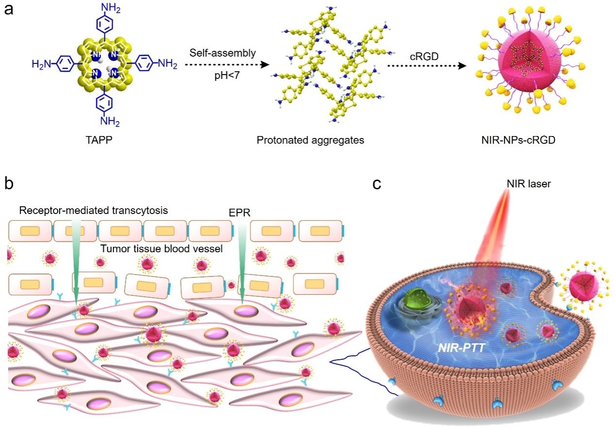 近红外光热治疗(NIR PTT)在肿瘤治疗中具有巨大的潜力,但开发高光热转换效率(PCE)的光热试剂(PTAs)仍然是一个重大挑战。白锋教授团队提出了一种“质子化操控分子自组装”策略,精确调节5,10,15,20-四(4-氨基苯基)卟啉(TAPP)中心吡咯氮的质子化,同时保留外围苯胺取代基上氮原子的孤对电子。所得的质子化二聚体促进了鞍形构象和类醌共振结构的形成,随后自组装成近红外纳米粒子(NIR NPs)。这些质子化二聚体增强了分子间的激子耦合,显著提高了卟啉自组装结构近红外区域的吸收能力和无辐射跃迁过程,使得PCE高达83.7%,显著超过多巴胺和传统卟啉衍生物等有机光热剂的光热转换效率。体外和体内研究表明,近红外纳米粒子能够有效消灭肿瘤细胞,同时表现出优异的生物相容性。本研究在超分子光敏剂的光谱调控同时实现了性能的显著优化,为芳香族含氮光热试剂功能分子的设计引入了创新方法。