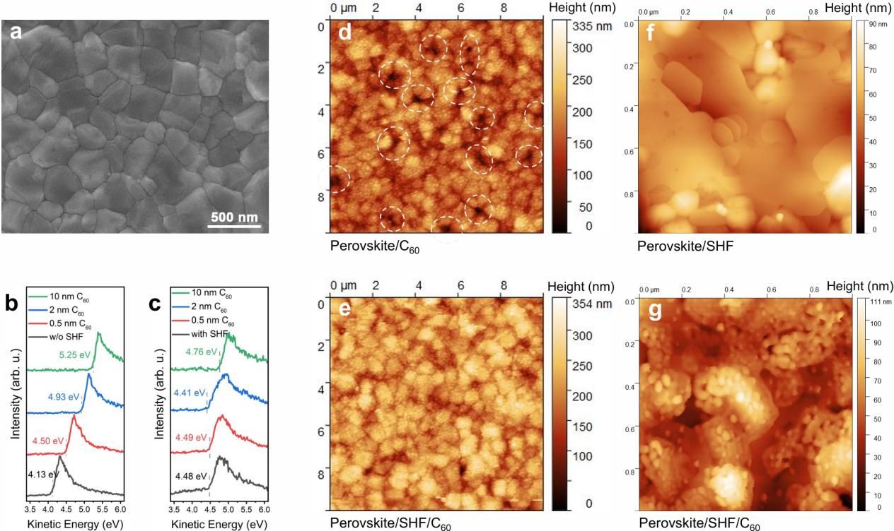 图2:(a)经SHF处理的钙钛矿薄膜的扫描电子显微镜(SEM)图像;在钙钛矿薄膜上不同沉积厚度的C60的截止区域的紫外光电子能谱(UPS)谱图,(b)未经SHF处理,(c)经SHF处理;原子力显微镜(AFM)图像:(d)钙钛矿/C60,(e)钙钛矿/SHF/C60(沉积了10 nm的C60),比例尺:10 μm;原子力显微镜图像:(f)钙钛矿/SHF,(g)钙钛矿/SHF/C60样品(AFM扫描取自不同区域,f)沉积时样品一半被覆盖,g)仅在另一半沉积了2 nm的C60),比例尺:1 μm;(d-g)中的色标代表表面高度(nm)。