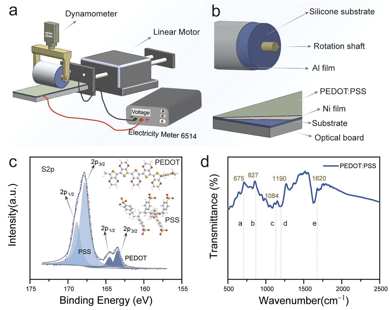 摩擦伏特效应是一种全新的力电耦合物理效应,产生在滑动的半导体界面(包括金属/半导体、半导体/半导体、液体/半导体的界面处)。其低电压、高电流密度和直流的电学输出特性受到了研究者的广泛关注。然而,摩擦伏特效应纳米发电机存在两个重要的问题:电流密度随着器件的尺寸增加而急剧下降;器件阵列化时由于半导体的导电特性在运动相位不匹配和磨损时将产生额外的能量损耗。研究团队构建了以硅胶为衬底的柔性铝转子,利用硅胶杨氏模量低的特点,减小了界面非接触区域,并构建了滚动模式的摩擦伏特效应纳米发电机,获得了高电流密度和高耐磨性。进一步,探索了阵列化中存在的能量损耗,并构建了相应的管理电路策略。