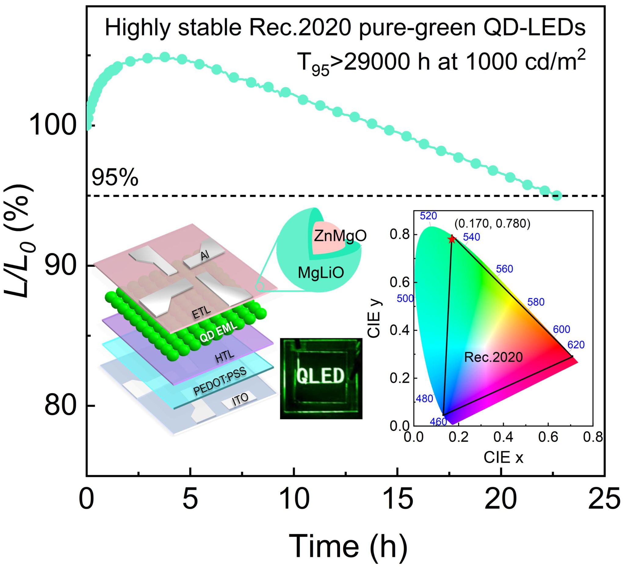 图1 纯绿色QD-LED的器件稳定性表征,插图为器件结构示意图,ZMO@MLO核壳结构纳米晶的结构示意图、器件电致发光照片和色度坐标。