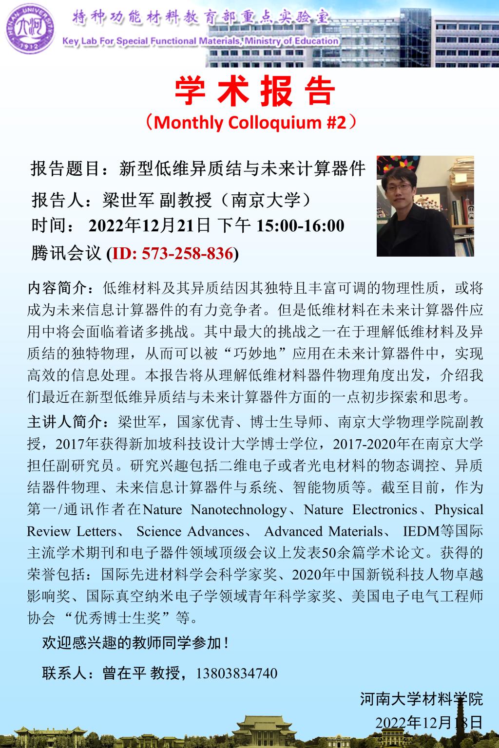 梁世军:新型低维异质结与未来计算器件(时间12.21)
