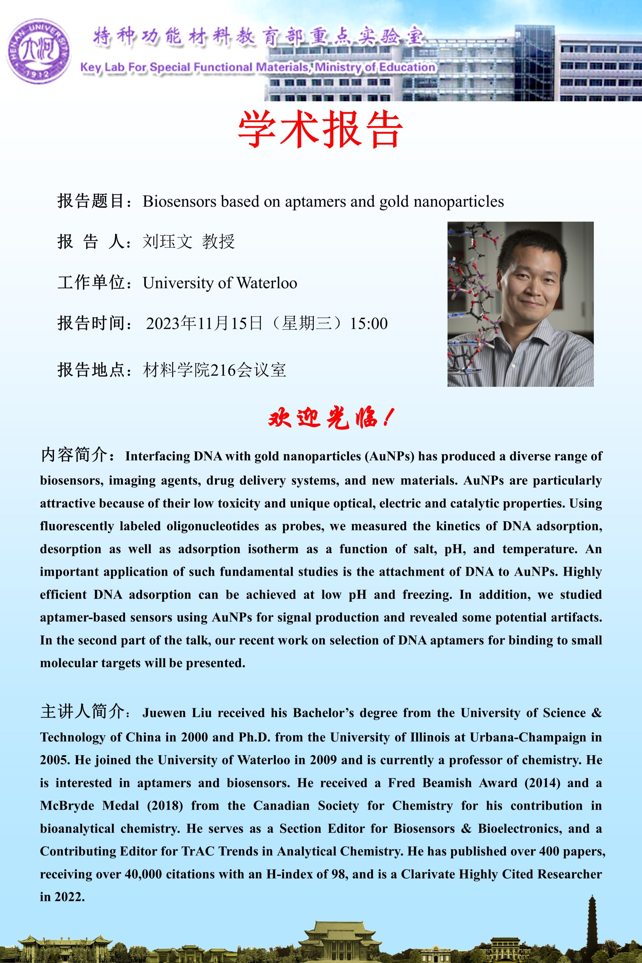 刘珏文:Biosensors based on aptamers and gold nanoparticles(时间11.15)