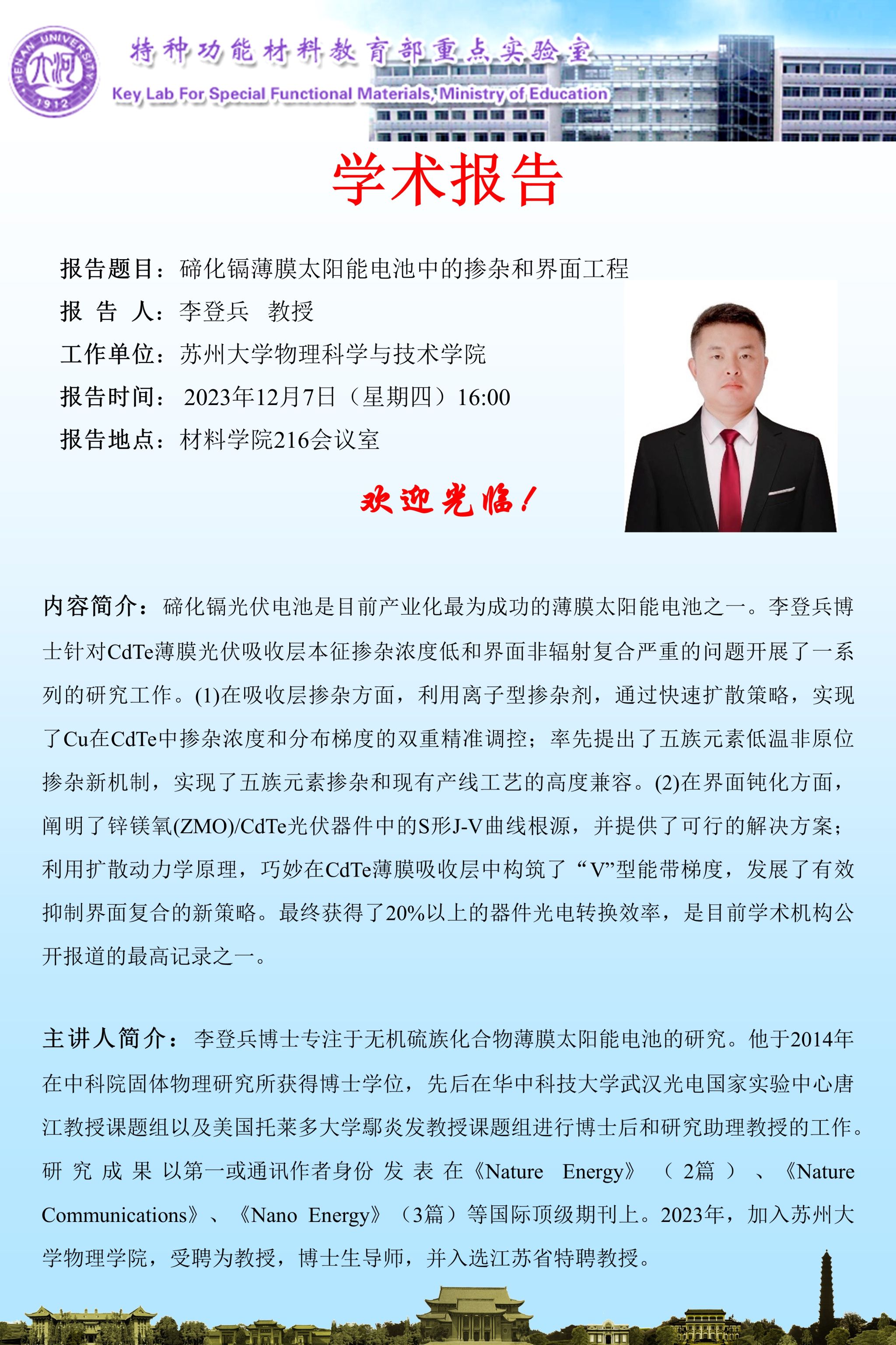 李登兵:碲化镉薄膜太阳能电池中的掺杂和界面工程(时间12.7)