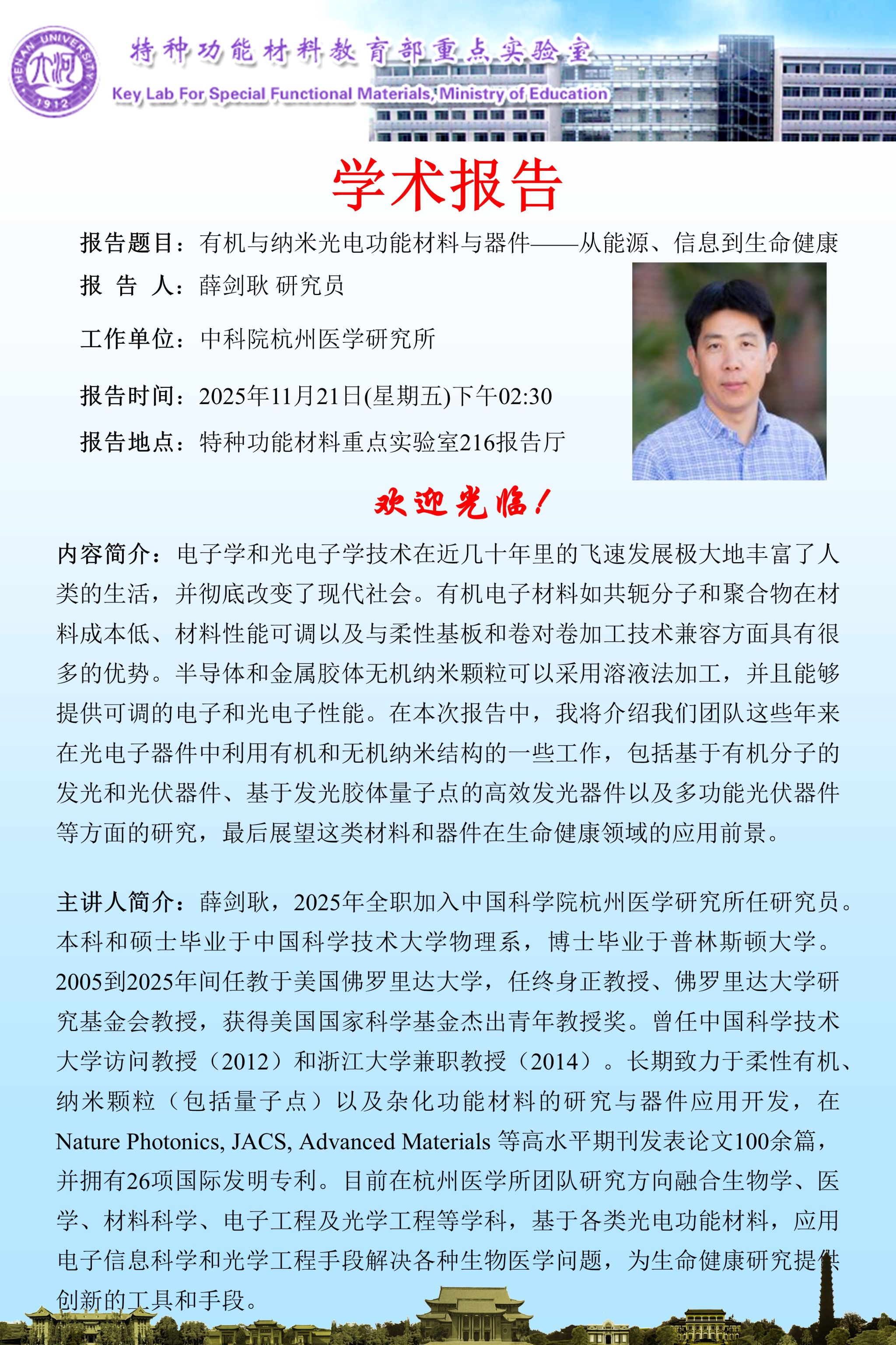 薛剑耿:有机与纳米光电功能材料与器件——从能源、信息到生命健康(时间11.21)