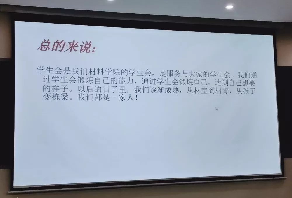 2019年10月27日下午,材料学院学生会成立大会在学院211报告厅召开。此次大会的召开标志着材料学院第一届学生会正式成立。本次大会的参会人员有团委老师李雪雪、学生会成员以及2019级全体本科生。