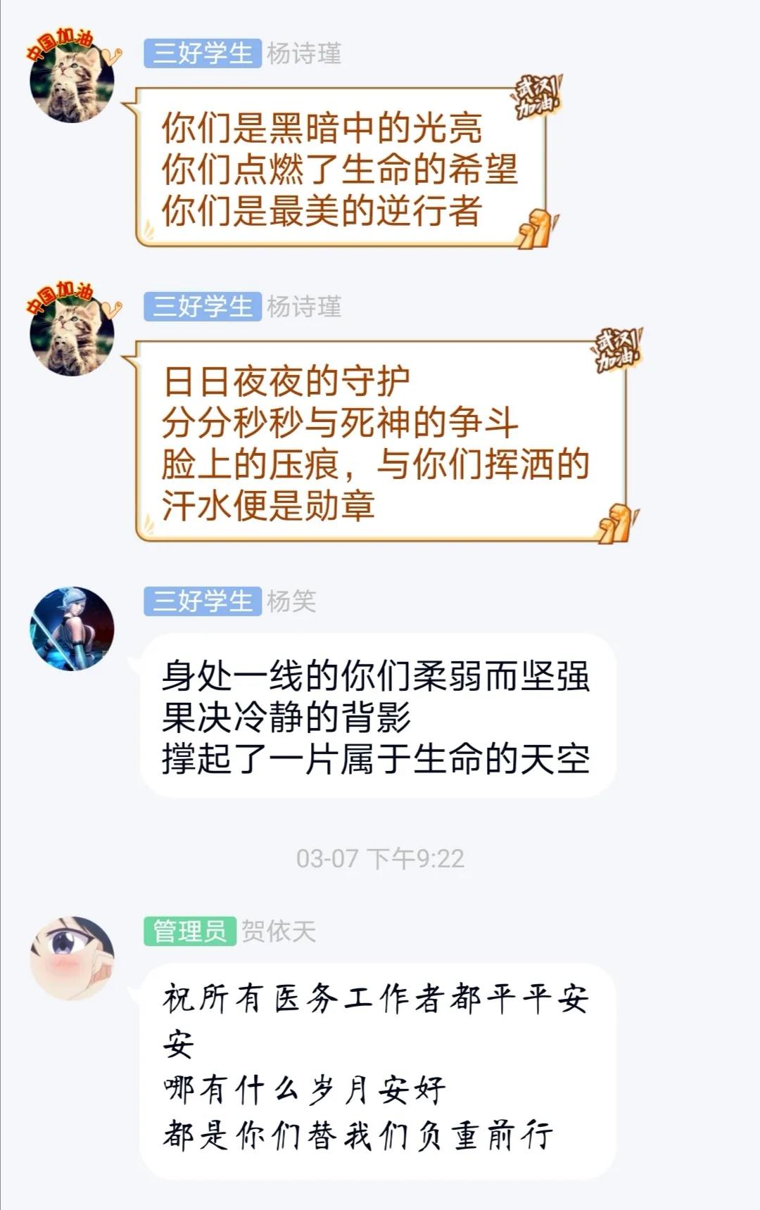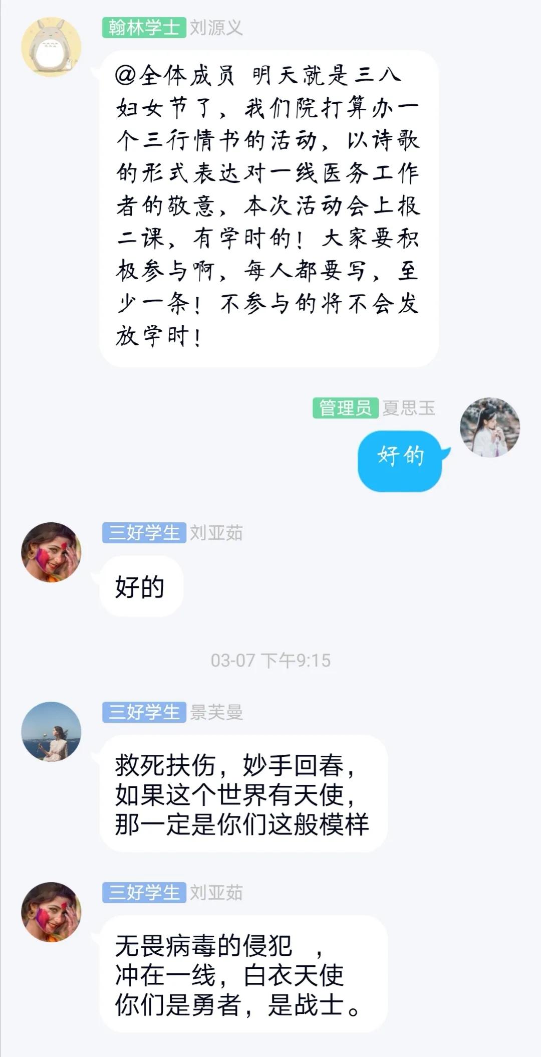 日前,习近平总书记强调,“当前,疫情防控正处于关键时期。”作为一名大学生团员,虽然在家学习,但心系疫情,时刻关注着“疫”情情况,也被无数英雄感动。因此,iQQTV 2019级本科生团支部特开展了一次以“三行情书——向抗‘疫’英雄致敬”为主题的团日活动。本次活动团员学生通过“三行情书”的形式向英雄们表达敬意,诉说真情。