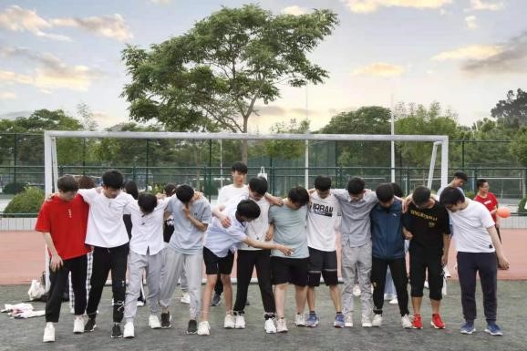 两人背夹气球,步调一致向前走,绕过转折点回到起点。球落地即为失败,重新开始挑战。该游戏有效地拉进了同学间的距离,同时也让不熟悉的同学更加了解彼此。