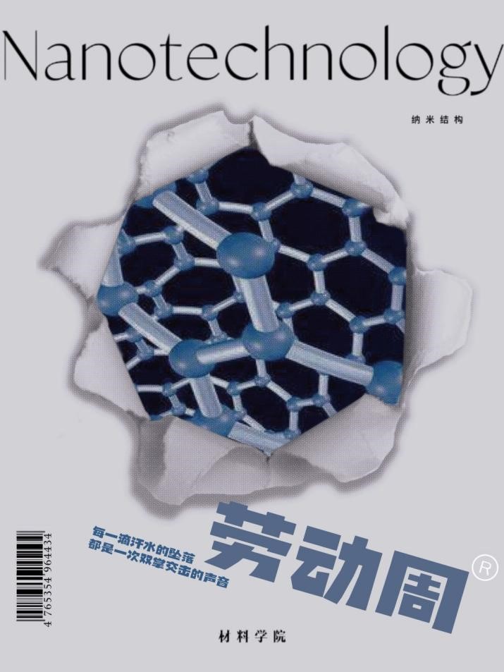 2021级-陈书芃海报设计说明:采用黑白蓝三色,清新简要,融合纳米结构的元素,并且加入了劳动周的元素,切合本次活动的主题,表现了学院的特性以及突出呈现劳动周的主题。