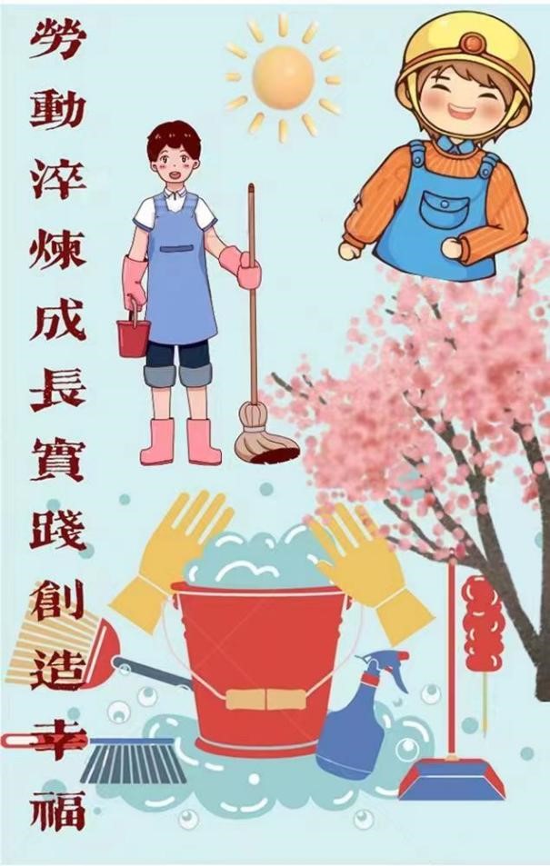 2021级-刘俊杰海报设计说明:海报背景以劳动工具为主,表明劳动的种类多种多样,且背景颜色干净,反映出来劳动过后环境的干净整洁;海报左侧的文字叙述的是本次活动主题,以鲜红的字体突出了整张海报的重点;海报上有两个劳动者形象,突出了人的参与;海报的中间顶部的太阳以及右下角处的樱花树,预示了劳动过后的美好。寓意着劳动会给我们的生活以及自然环境带来美好,与此次主题相呼应。