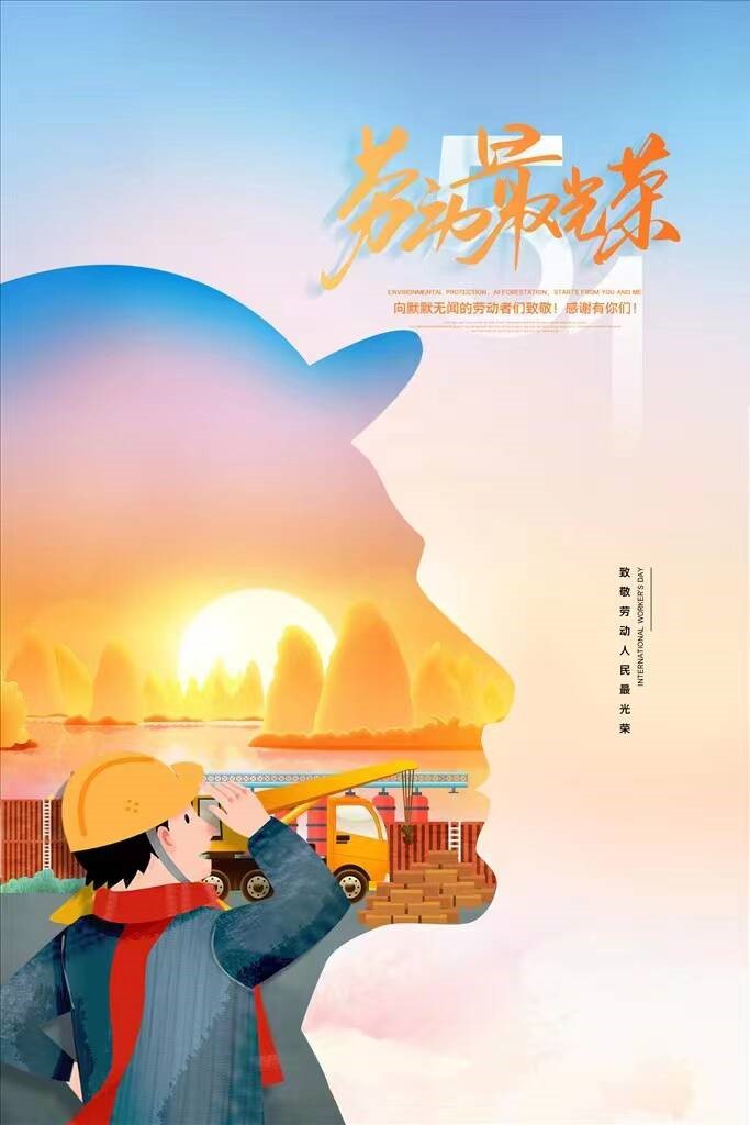 2021级-毛昱博海报设计说明:左侧是劳动者脸的轮廓,脸中映衬着日落劳动者辛勤劳动的画面,意在体现劳动者的辛苦劳作。右侧是海报的主题“劳动最光荣”和对劳动者表达的敬意。