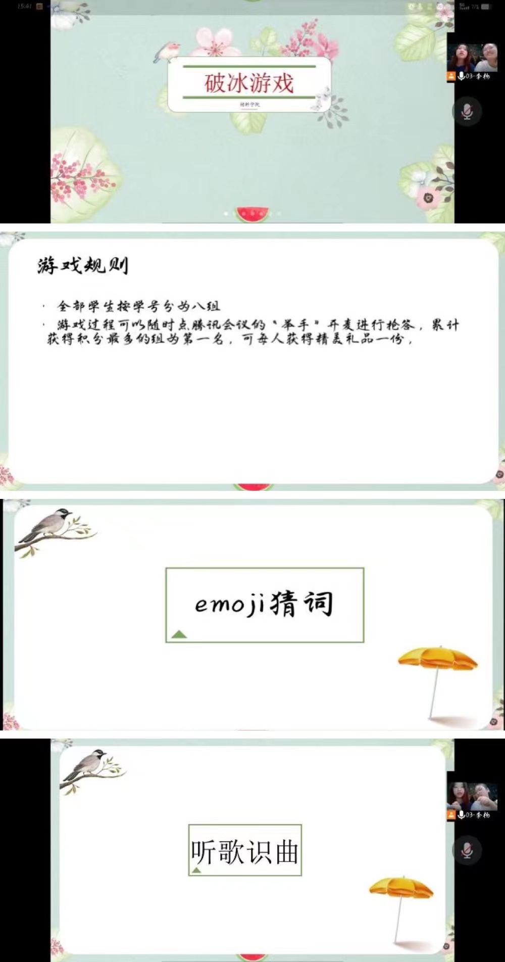 接着,为使2022级新生打破陌生感,拉近新生与新生、新生与老生之间的距离,尽快融入大学生活,感受大学氛围,欢迎大会的第一个环节就是线上“破冰”游戏。该“破冰”游戏由学生会主席李杨与张漫漫引导进行,并对游戏胜出的小组颁发奖品。游戏中,同学们积极互动,情绪高涨,纷纷举手并在聊天框讨论发言。