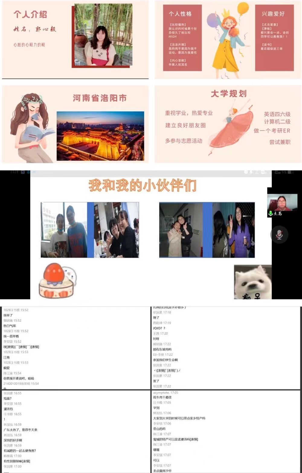 在“破冰”游戏的欢声笑语中,会议进入新生自我介绍环节。新同学们都提前做好了准备,有的同学写了自我介绍的发言稿,有的同学准备了自我介绍的PPT,一个个敞开心扉,认真发言,大胆展示,介绍兴趣爱好,并分享亲身的一些珍贵经历。通过自我介绍,不仅让新同学之间认识熟悉彼此,更是进一步激发了新同学对大学生活的热情与向往。
