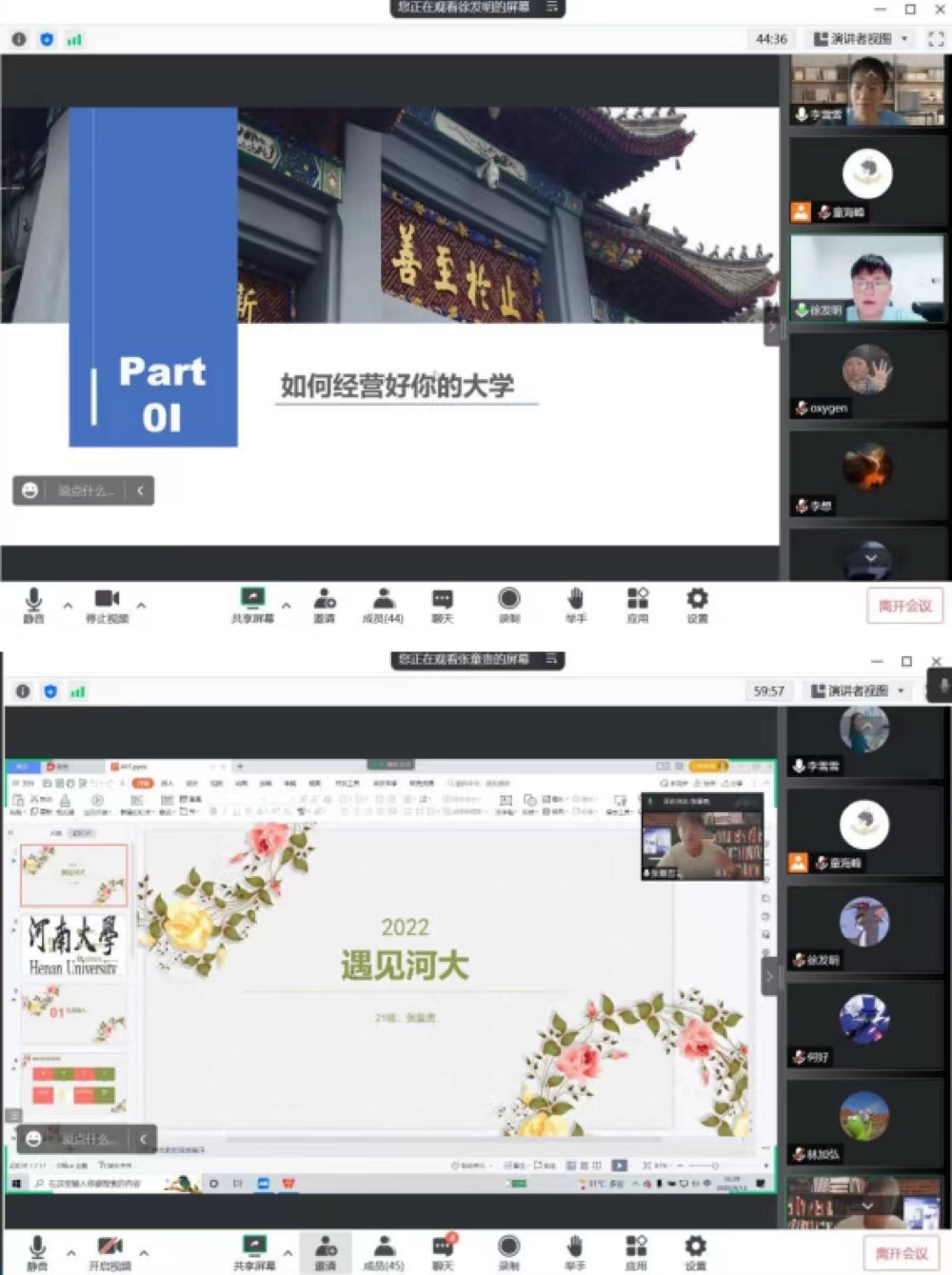 随后,在2022级辅导员李雪雪的带领下,由2021级优秀学生代表张童贵和徐发明同学结合亲身经历,向22级新生们共享大学生活小技巧,分享学习方法,解答同学们所提出的问题,并讲述自己一年来的大学收获与感悟,鼓励新生们努力的学习,开拓视野,发掘提升综合能力。通过两位学长的分享与解答,旨在使同学们尽快适应大学生活,完成从身体到心理的状态转变,实现由高中生到大学生角色的转变。