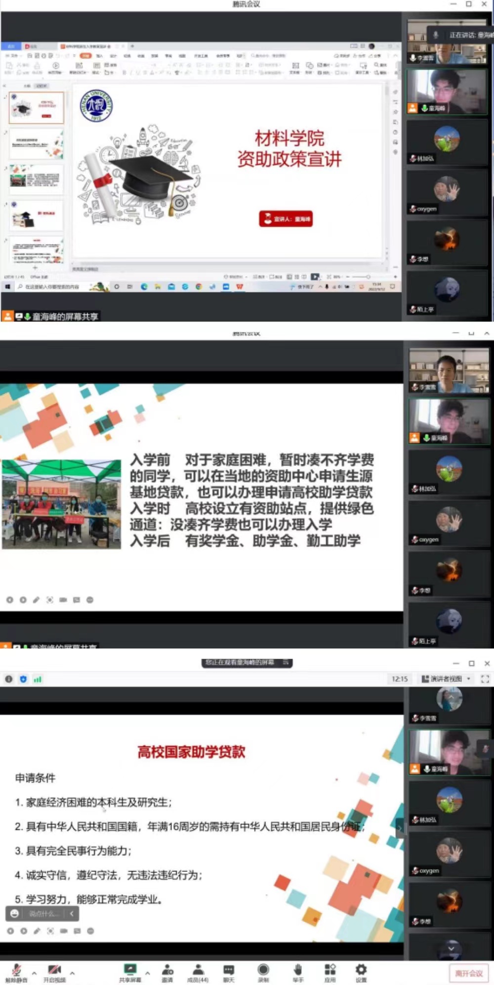 9月12日下午,材料学院资助政策宣讲会议线上展开,本次主题教育由辅导员李雪雪和学院资助服务工作站队长童海峰共同讲解。童海峰从国家奖学金、国家励志奖学金、高校国家助学贷款、生源地信用助学贷款、新生绿色通道、社会资助、勤工俭学、临时困难补助、学费减免、服务基层国家助学贷款代偿、服兵役学生学费补偿助学贷款代偿等为同学们讲解高校学生资助政策体系,让同学们了解到从入学前一直到毕业后,所对应的各项资助。李雪雪对国家和学校资助工作的目的与意义向同学们进行了阐释,引导同学们正确看待资助工作,怀感恩之心,立远大理想,为祖国贡献青春力量。