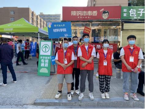 材料学院”立牌,做好接待准备,并按照学校要求,引导新生保持安全间隔距离有序排队。