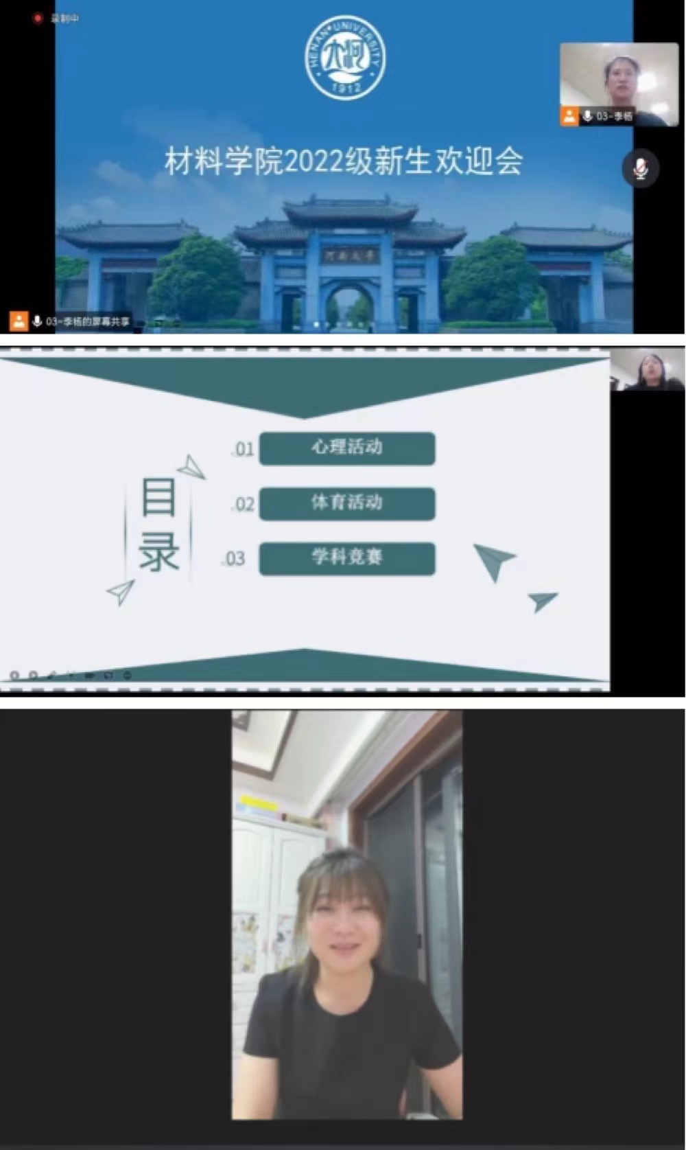 召开2022级本科新生线上欢迎会。学院党委副书记石宇珺、新生辅导李雪雪、学生会主席团成员李杨及2022级全体新生参加。会议伊始,李雪雪从疫情防控、宿舍生活、财务安全及网络安全等方面向新生介绍相关规定、要求和注意事项,并真诚祝福同学们青春如花绽放,生命如海奔腾。随后,李杨向新生着重介绍学院特色活动,并就怎样适应大学生活,向新生分享经验。会议最后,党委副书记石宇珺向全体2022级新生的到来表示热烈欢迎和诚挚祝贺,并向新生提出期望与建议:珍惜美好的大学时光,奋力书写属于自己的青春篇章;努力学习,提高素质,不断积累、创造与成长;树立明确的目标,选择正确的人生方向;主动融进班级,走进同学,贴近辅导员,积极融入大学生活,希望同学们在体验美好大学的同时,也要做好大学规划,让青春在大学里沉淀滋长,用青春的创造力激荡梦想的澎湃浪潮。