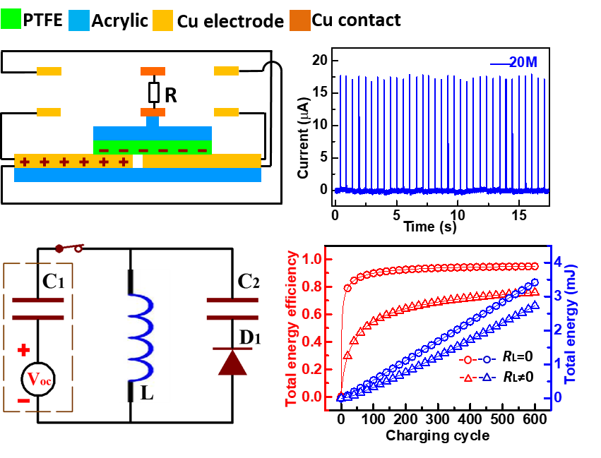 另外,在单极性脉冲TENG的基础上,程纲课题组设计了由电感、二极管和储能电容等简单原件组成的无源电源管理电路,能量存储效率可以达到48.0%,有望在TENG的自驱动传感系统中发挥重要作用。该工作“High energy storage efficiency triboelectric nanogenerator with unidirectional switch and passive power management circuit”在国际著名期刊Advanced Functional Materials(2018, 1805216)上发表。iQQTV